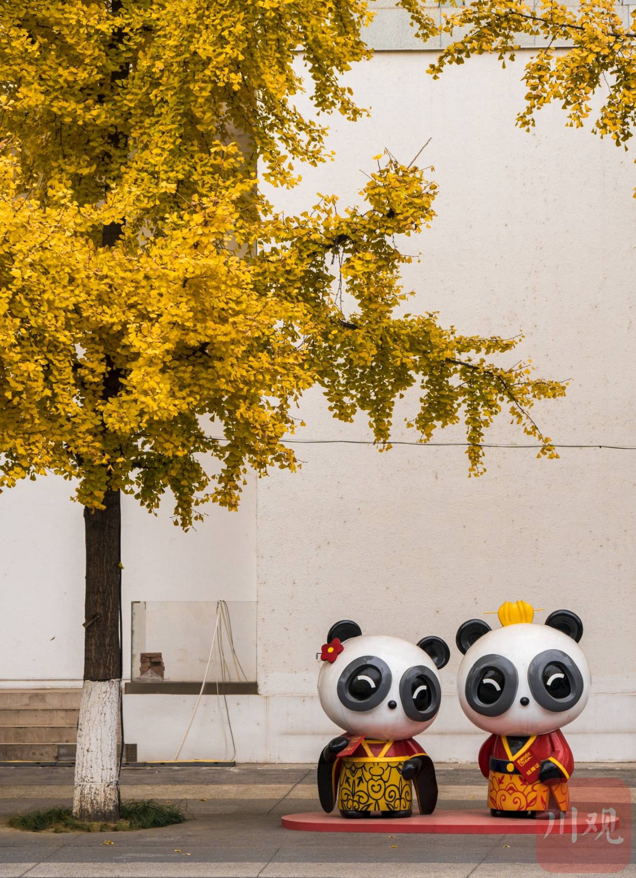 12月13日晚,华灯初上。灯光照射到成都市合江亭爱情斑马线旁的银杏树上,由树枝天然形成的心形图案就投射到白墙上,与前面一对熊猫“新婚夫妇”的城市雕塑相映成趣。