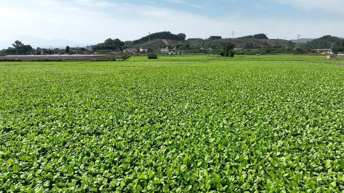 虽已大雪节气,这里的农田却别样丰茂——一棵棵泽泻舒展着肥大的绿叶,在田里铺展,一直蔓延到远处的山丘边。