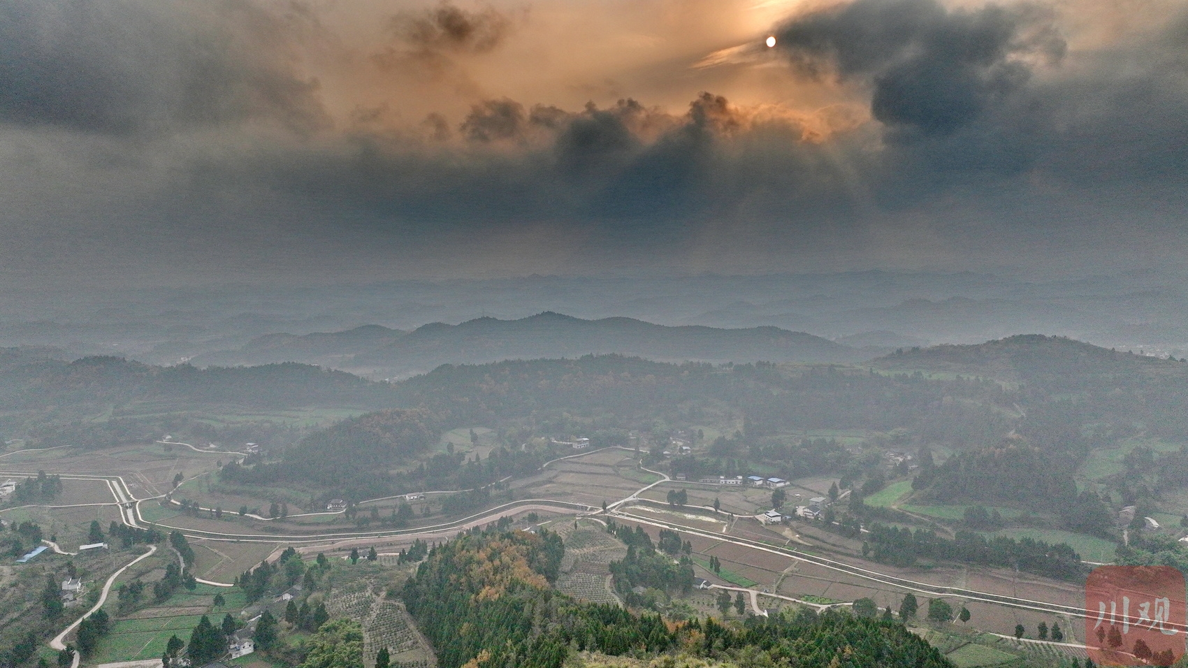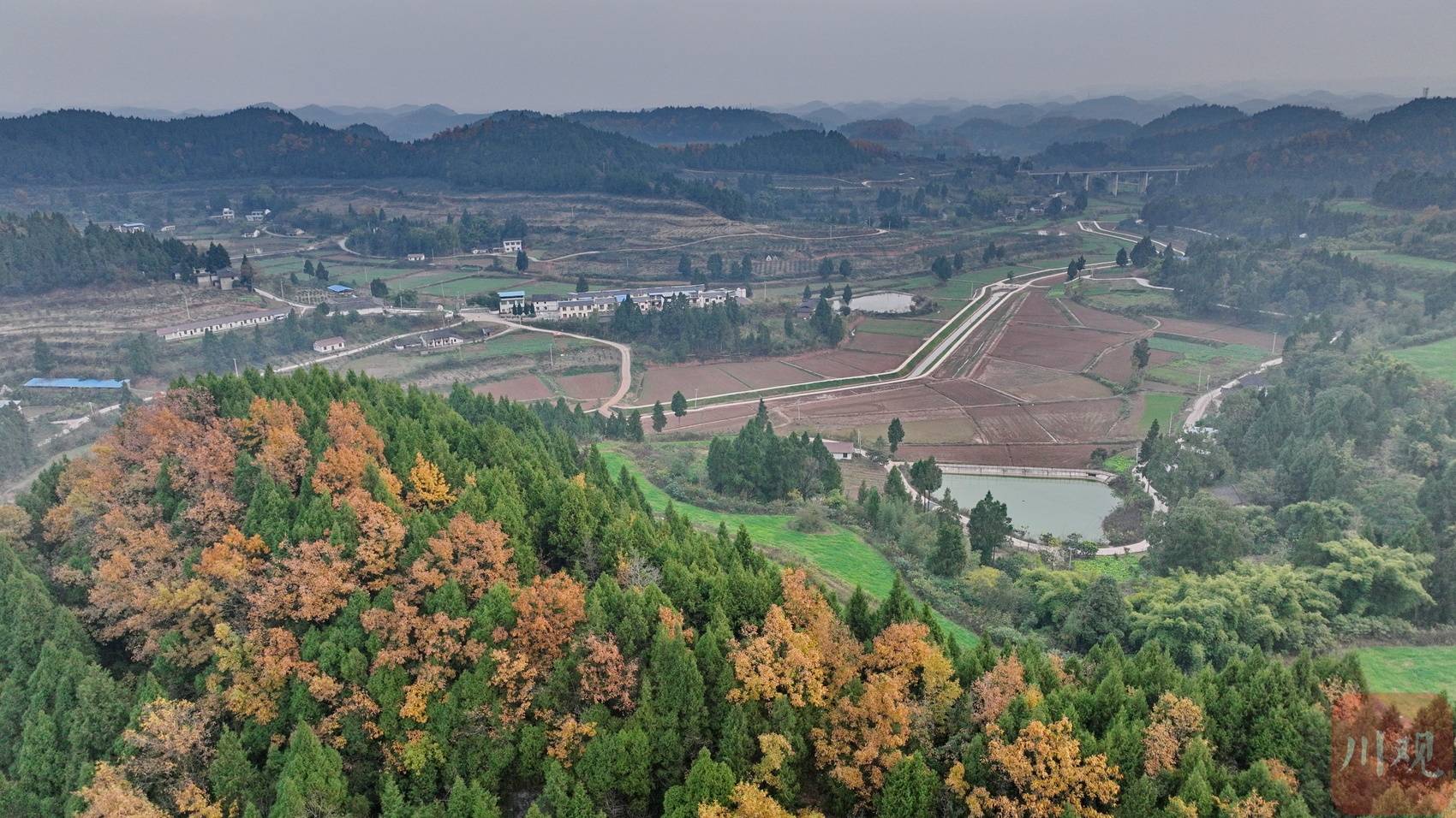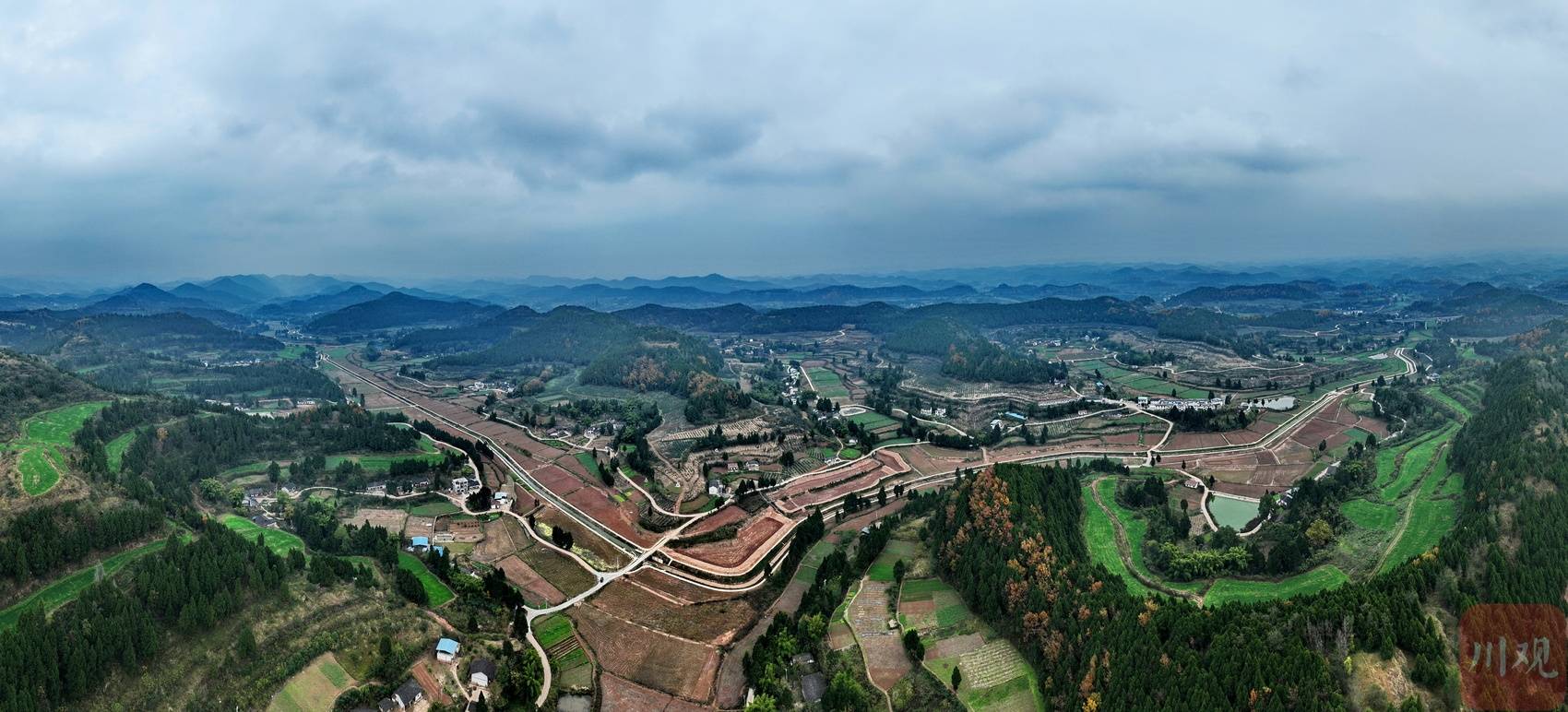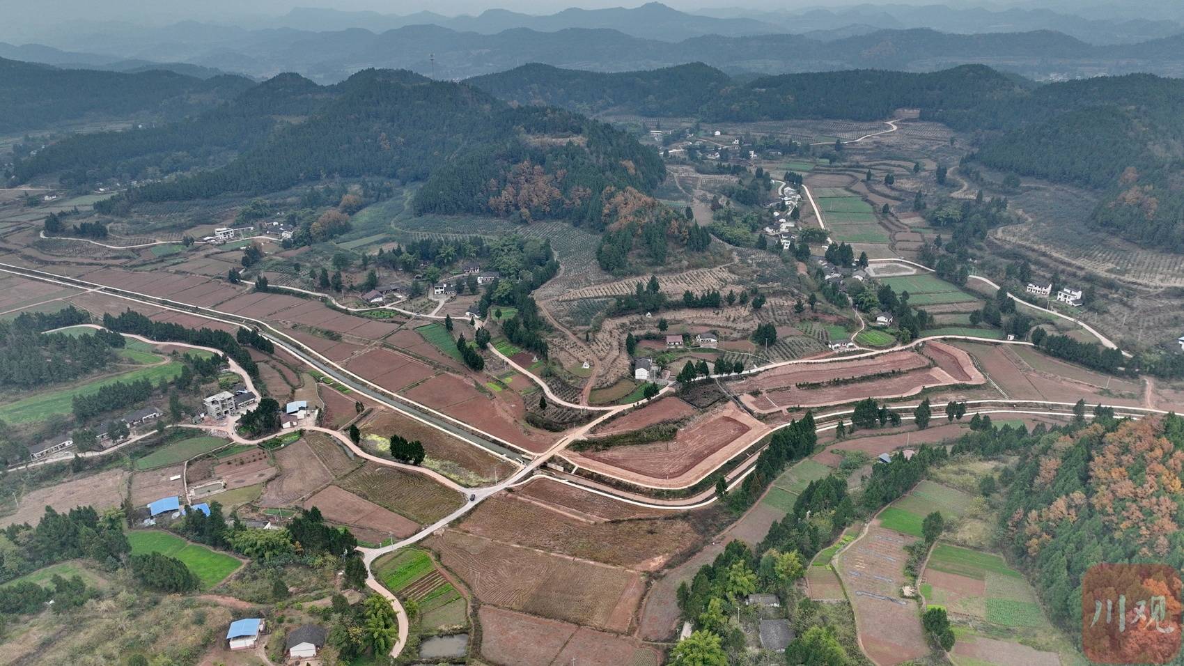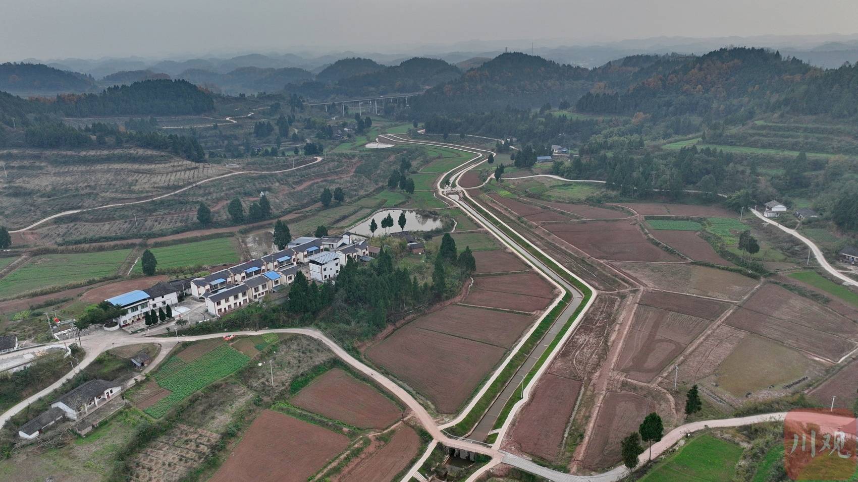 12月14日,四川在线记者走进四川省南充市嘉陵区七宝寺镇宫子岭村,俯瞰被群山环抱的高标准农田。一条条水渠和生产道路纵横交错,一片片田地整齐划一,呈现出一幅“田成方、路相通、渠相连、旱能浇、涝能排”的沃野美景。