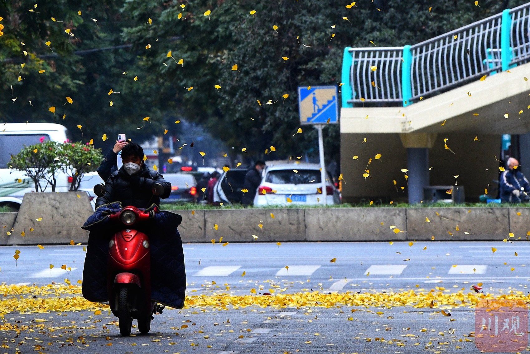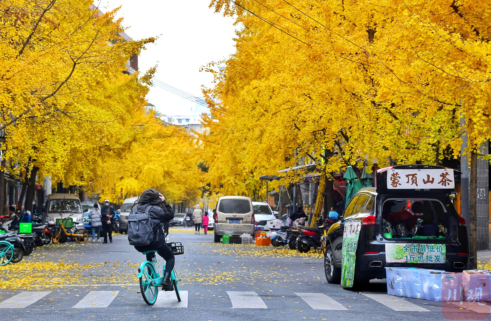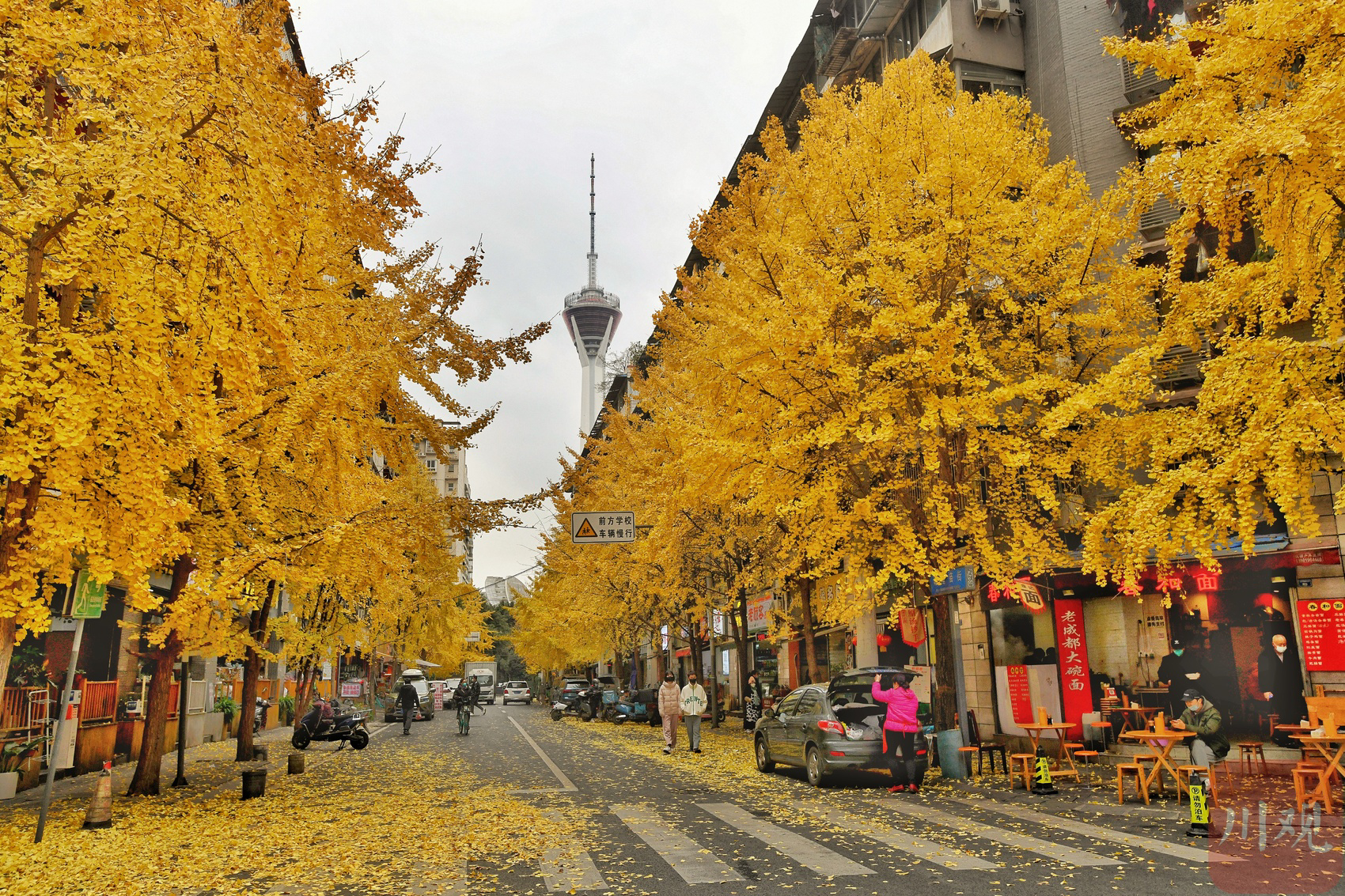 12月16日,北风让冬天的成都街头泛起阵阵寒意,但玉皇观街、城隍庙街和昭忠祠街却是另一番景象。行驶的车辆减速了、匆匆行人都放慢了脚步,映入眼帘的是满目金黄银杏叶在风中起舞,浪漫的烟火气早已扑面而来。