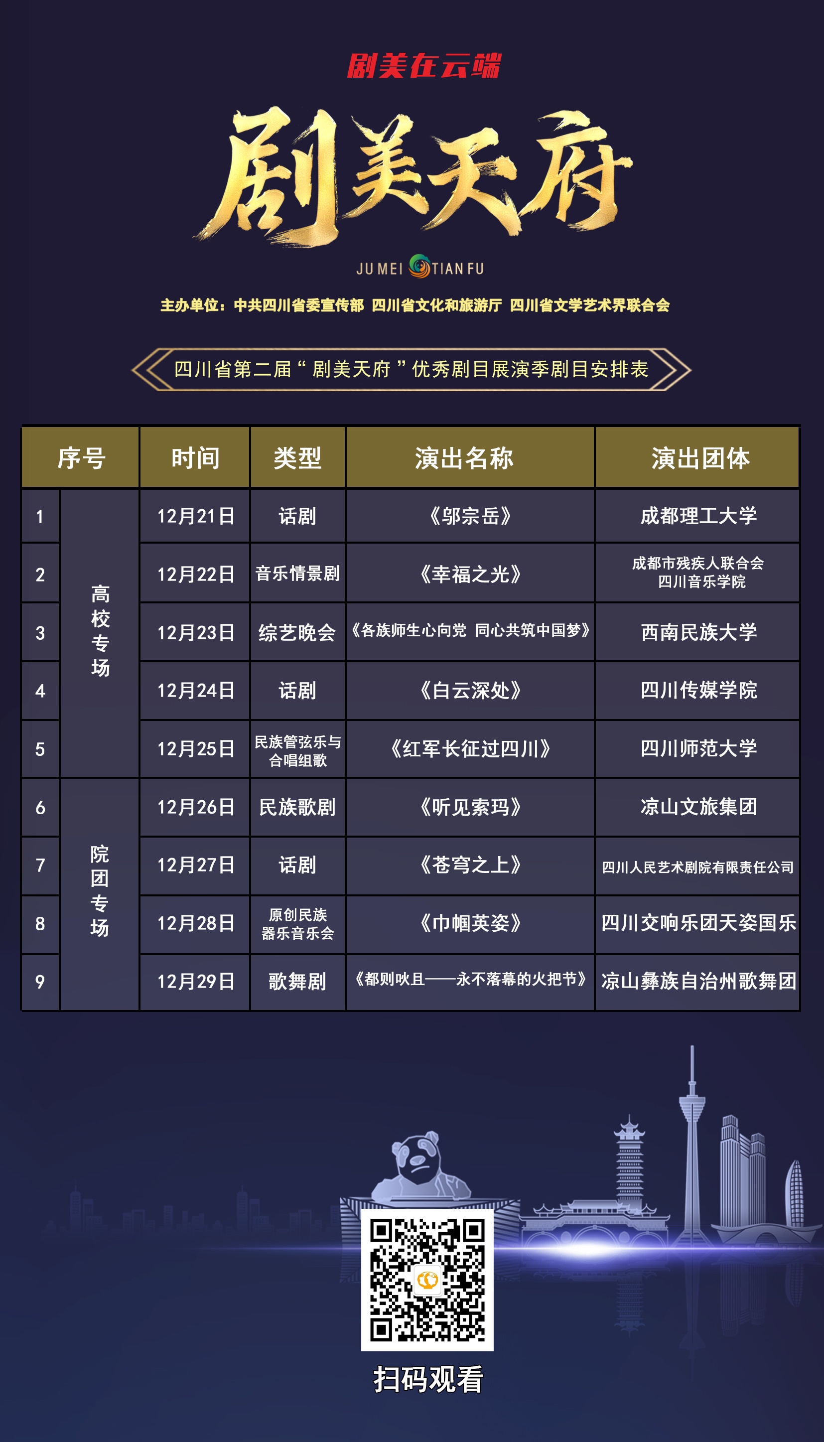 由中共四川省委宣传部、省文化和旅游厅、省文联主办的四川省第二届剧美天府优秀剧目展演季线上展播活动即将于12月21日拉开帷幕,届时将为广大观众献上11场“云端”演艺盛宴,努力打造“掌上云端”艺术殿堂,探索构建“线上线下融合、演出演播并举”的演出新业态。