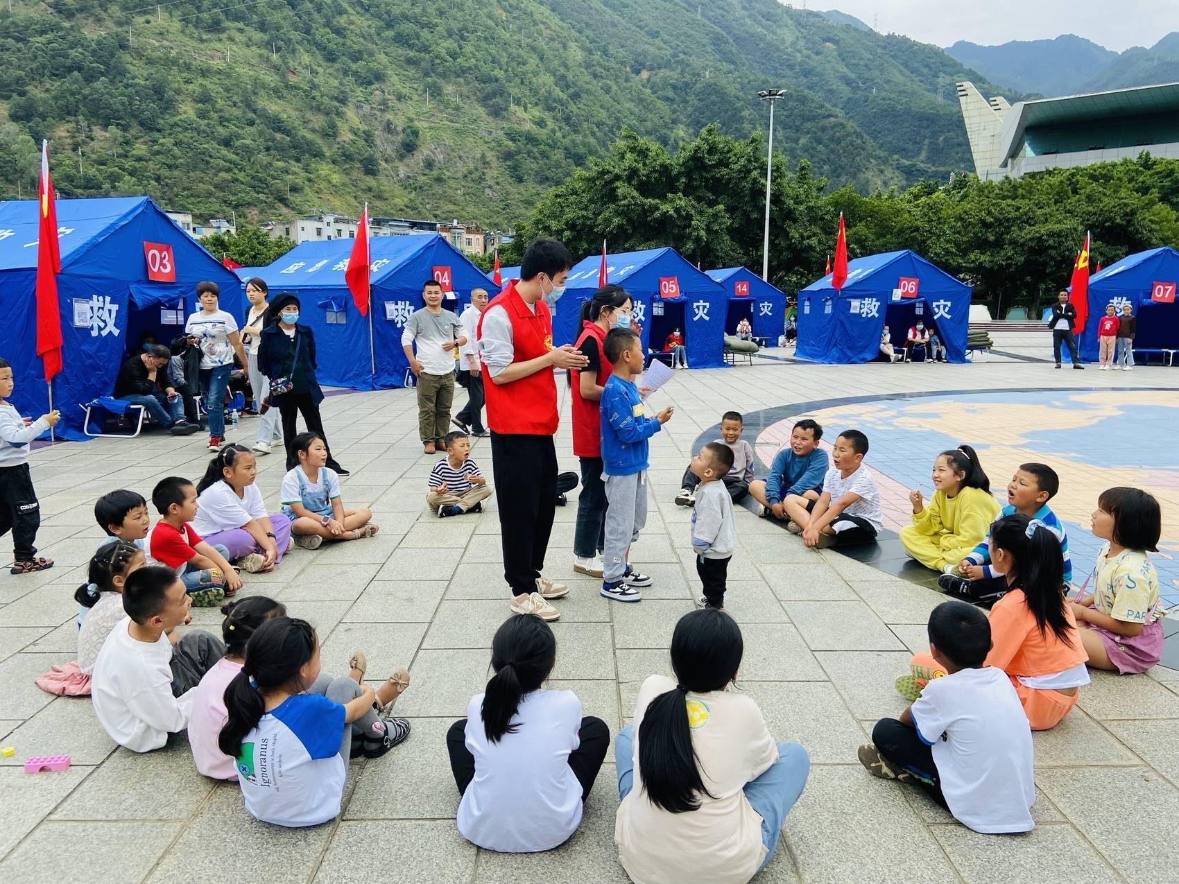 在泸定地震石棉县临时安置点,青年志愿者组织小朋友一起做游戏。应急管理厅供图