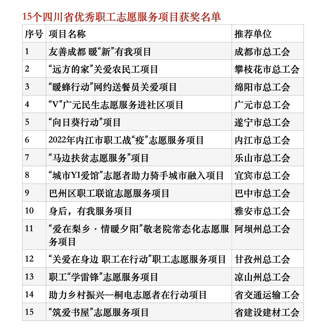 12月30日记者从四川省总工会获悉,近期启动开展的2022年“点亮工会蓝 创造新奇迹”四川省优秀职工志愿服务项目评选展示活动,经申报初评、项目展示、网络投票,以及专家评审、公示等环节,最终评选出15个优秀职工志愿服务项目。