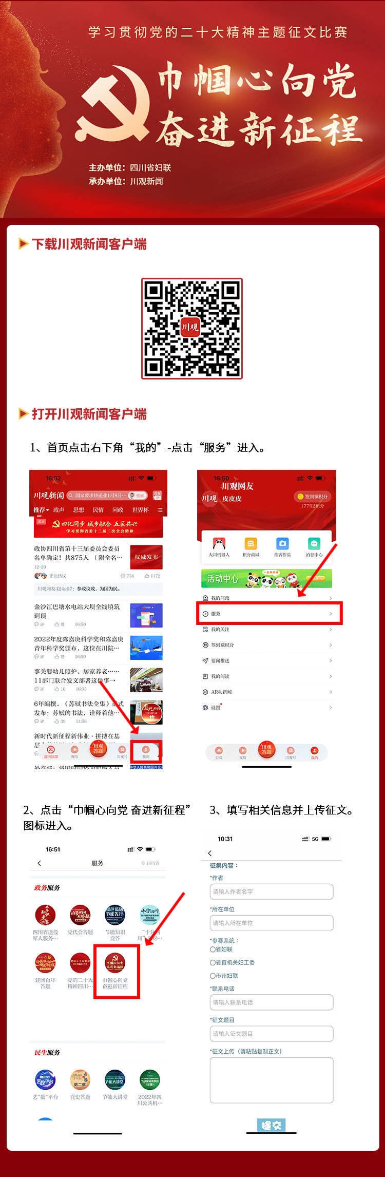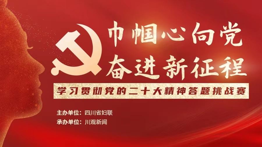为深入学习宣传贯彻党的二十大精神,深刻领会党中央对妇女事业和妇联工作的殷切期望,推动党的二十大精神在妇联落地落实,团结引领广大妇女听党话、跟党走,日前,四川日报川观新闻客户端联合省妇联,面向全省各级妇联组织、机关企事业单位妇女组织及广大妇女群众,开展了学习贯彻党的二十大精神巾帼大学习答题挑战赛和征文活动,活动从12月下旬开始,将持续到2023年3月。