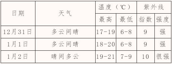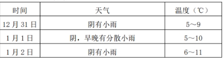 12月31日晚上到1月1日白天小雨转阴,气温3~8℃。