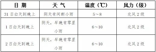 31日晚上到1日白天 阴天有小雨,高海拔山区有雨夹雪或小雪,气温4~8℃;