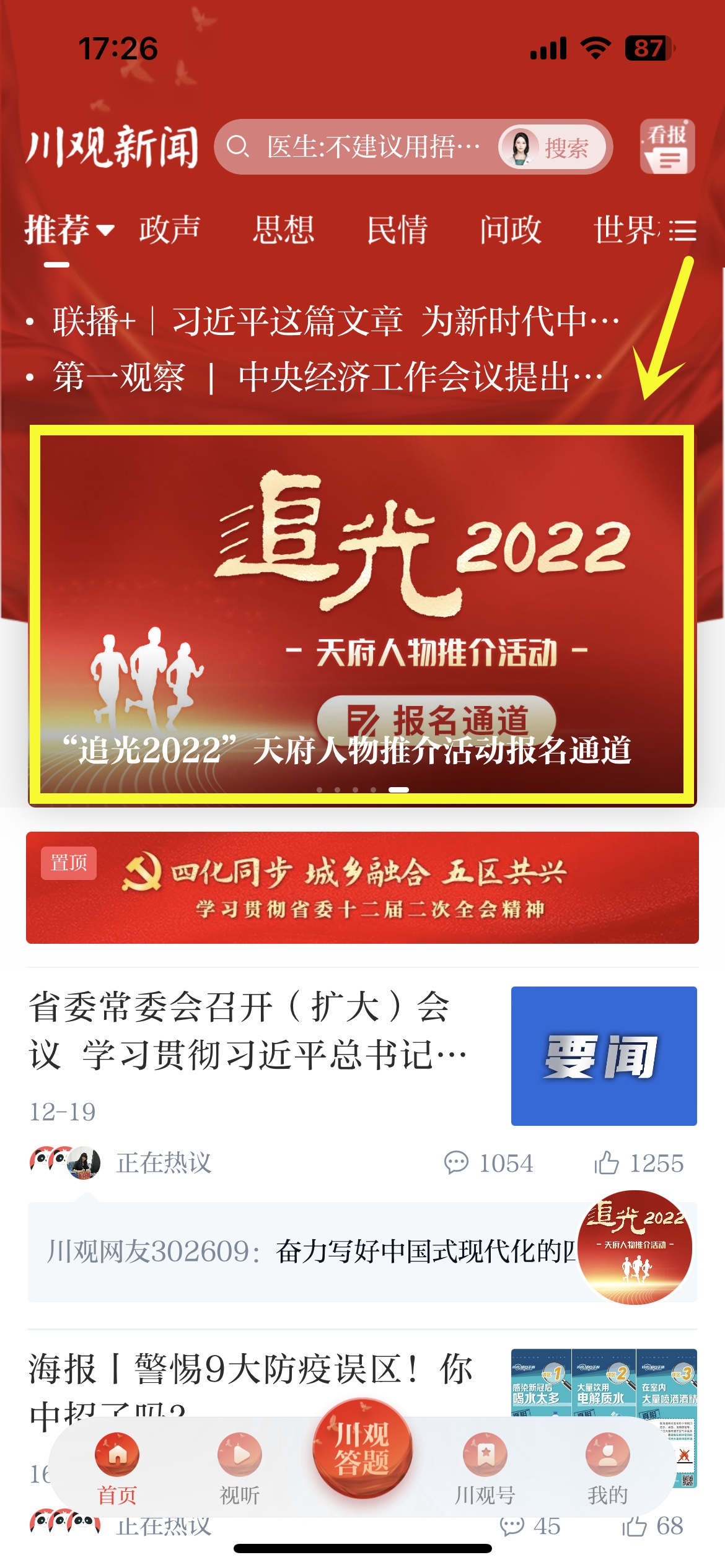 1、登录川观新闻客户端,点击上方“追光2022”天府人物推介活动报名通道,或点击右侧悬浮球进入报名通道。
