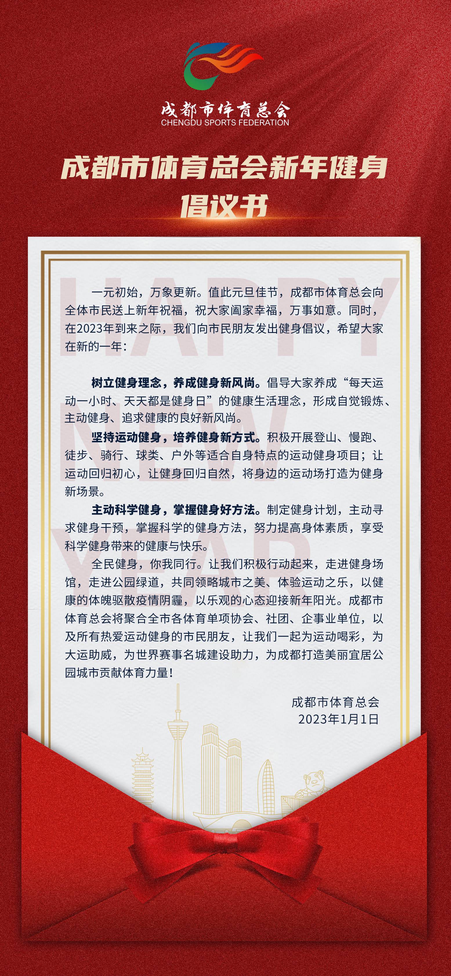 一元初始,万象更新。值此元旦佳节,成都市体育总会向全体市民送上新年祝福,祝大家阖家幸福,万事如意。同时,在2023年到来之际,我们向市民朋友发出健身倡议,希望大家在新的一年: