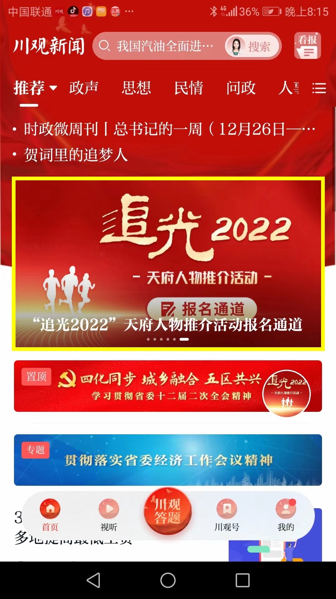 1、登录川观新闻客户端,点击上方“追光2022”天府人物推介活动报名通道,或点击右侧悬浮球进入报名通道。