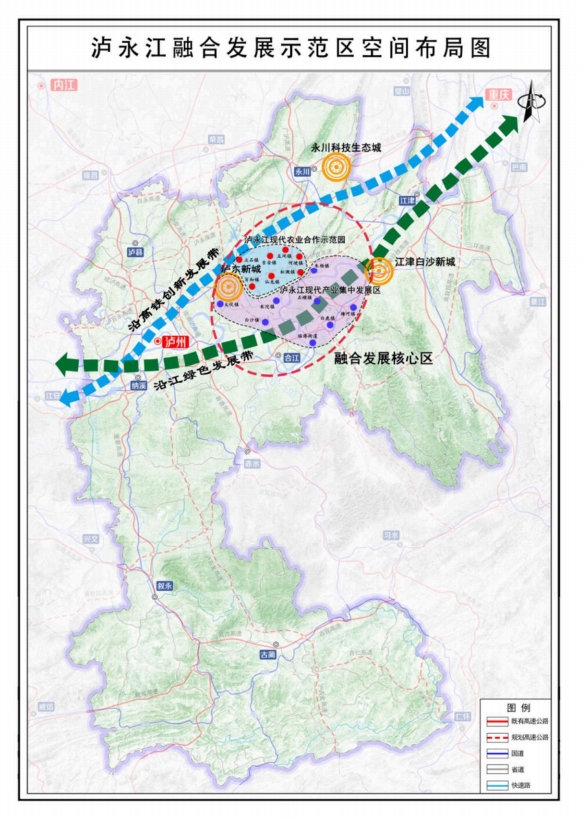泸永江融合发展示范区将依托成渝、联动三地、融合发展、形成示范,推进基础设施、产业体系、开放合作、生态环保、公共服务相互融合、互促共进,努力打造成渝地区双城经济圈南翼跨越发展重要增长极,推动形成高质量发展动力源,形成有实力、有特色、可复制的跨省际区域融合发展示范区。