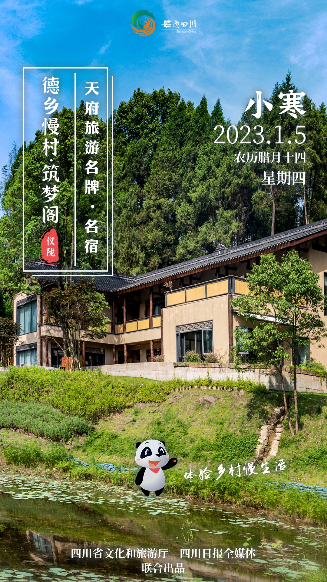 1月5日,星期四,是传统二十四节气中的小寒。今日天府旅游名牌日历海报继续领略天府旅游名宿的别样风景,在南充市仪陇县德乡慢村·筑梦阁民宿感受乡村“慢生活”。
