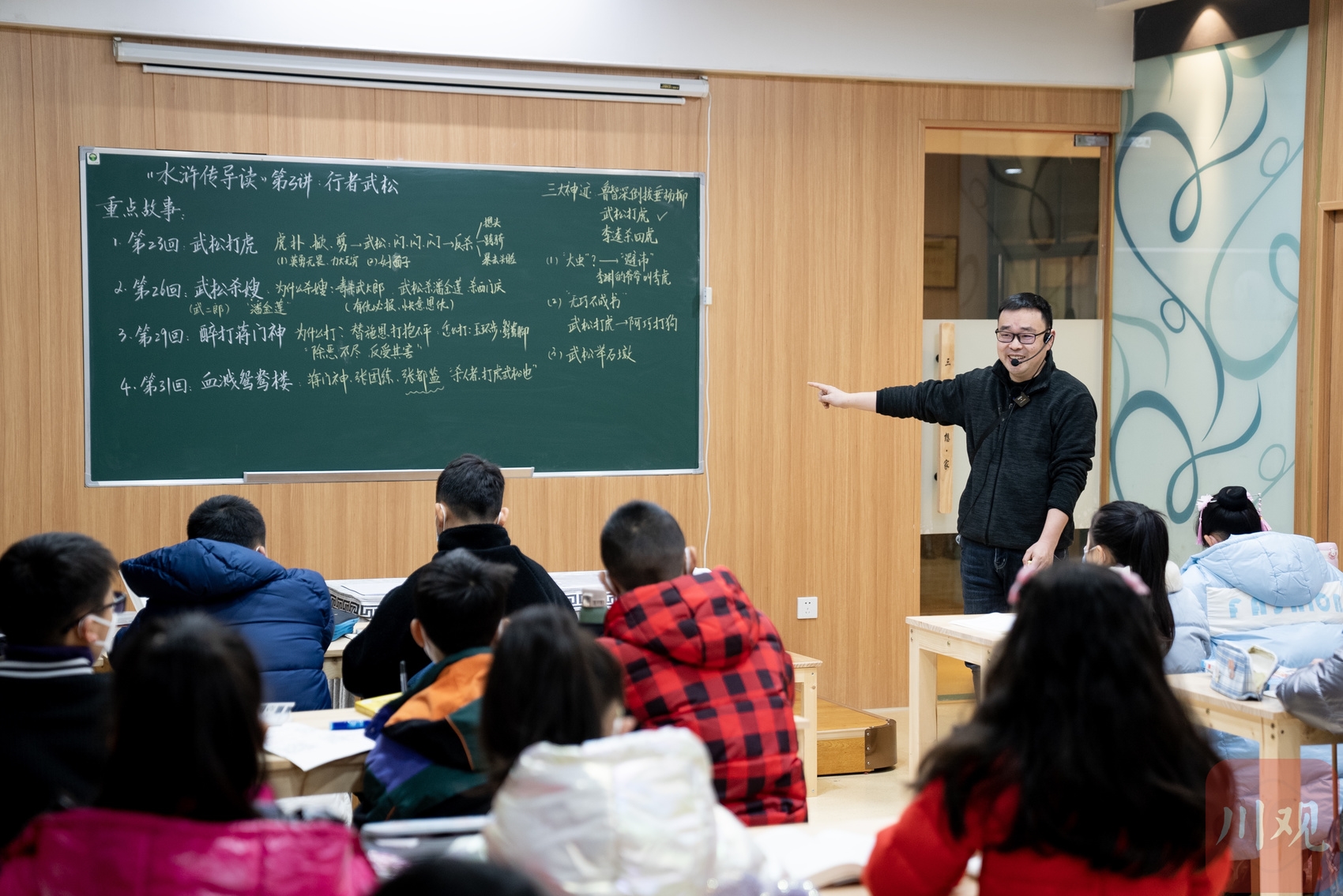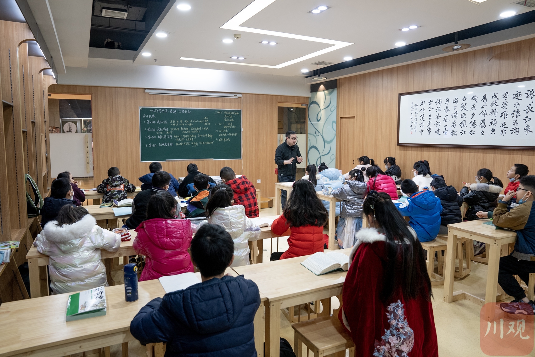 1月4日,在成都购书中心“三国梦想·家”里,原四川省省级骨干教师、现“三国梦想·家”空间主理人陈凯正在给孩子们上一堂精彩的《水浒传》导读课,通过人物导读和故事导读,揭示这部名著的整体风貌和深刻内涵。