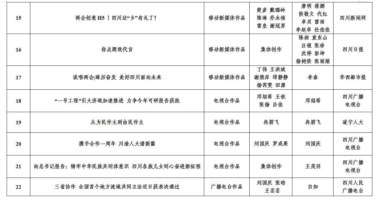 评选委员会按照“依据评委票数、突出主责主业、倾斜基层一线、兼顾主流媒体”的原则,评选出获奖作品和优秀记者,共有68件作品获奖。其中,包括四川日报选送的《四川代表团部分代表与国家发展和改革委员会“云端”对话 短短1小时 14位代表提了27条建议》等14件作品获一等奖。