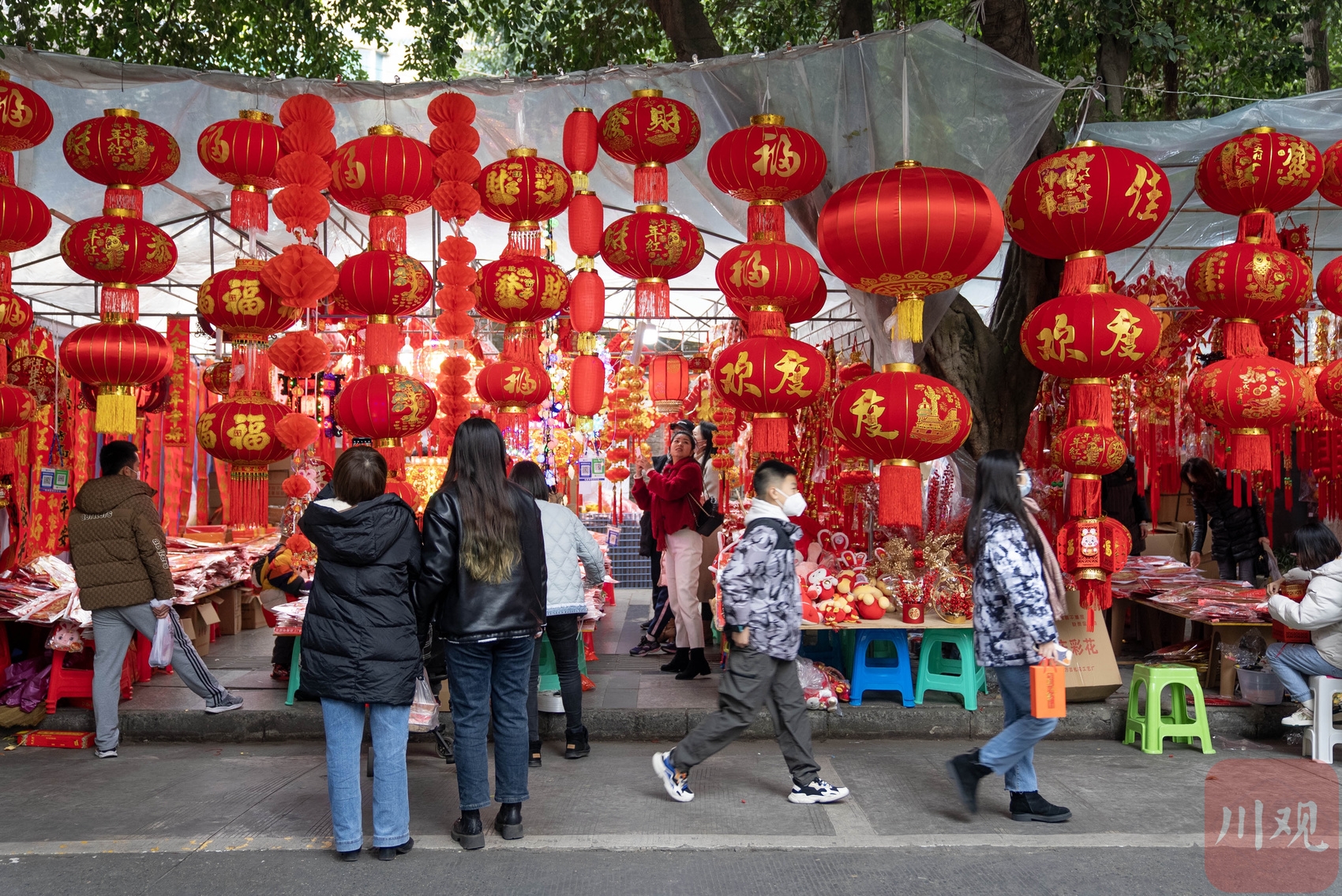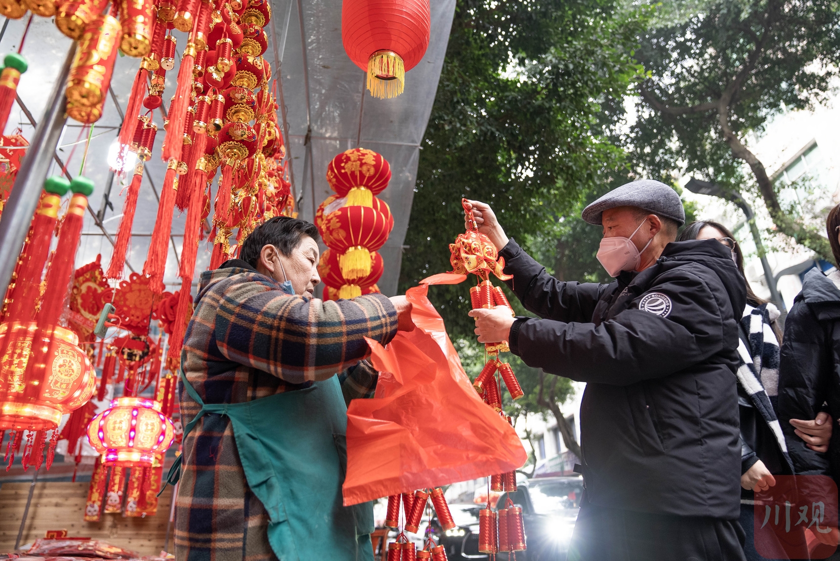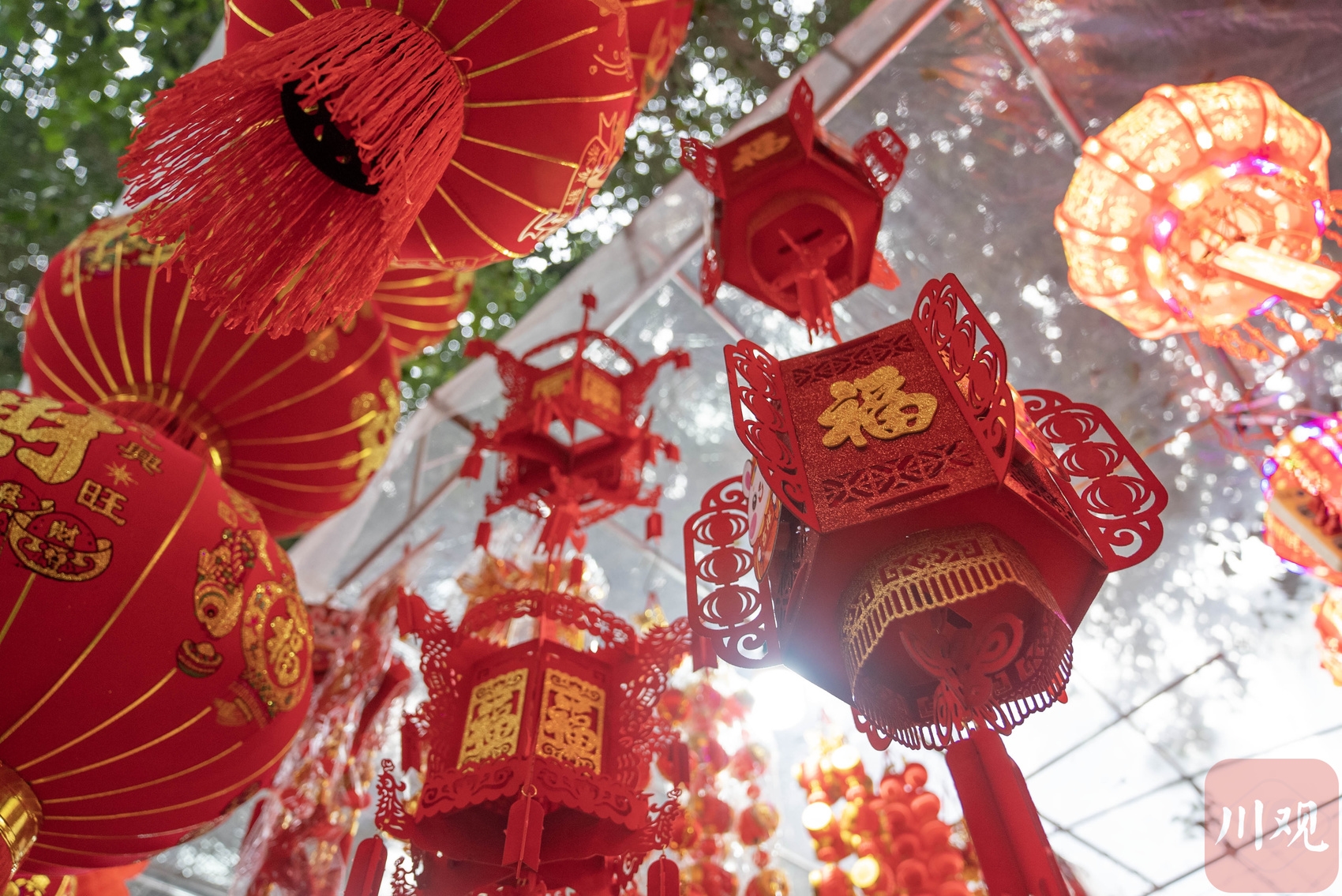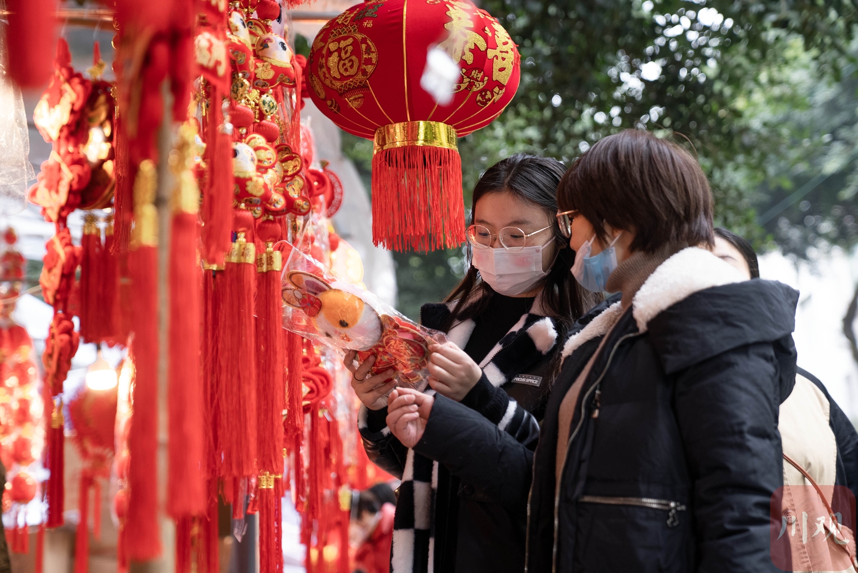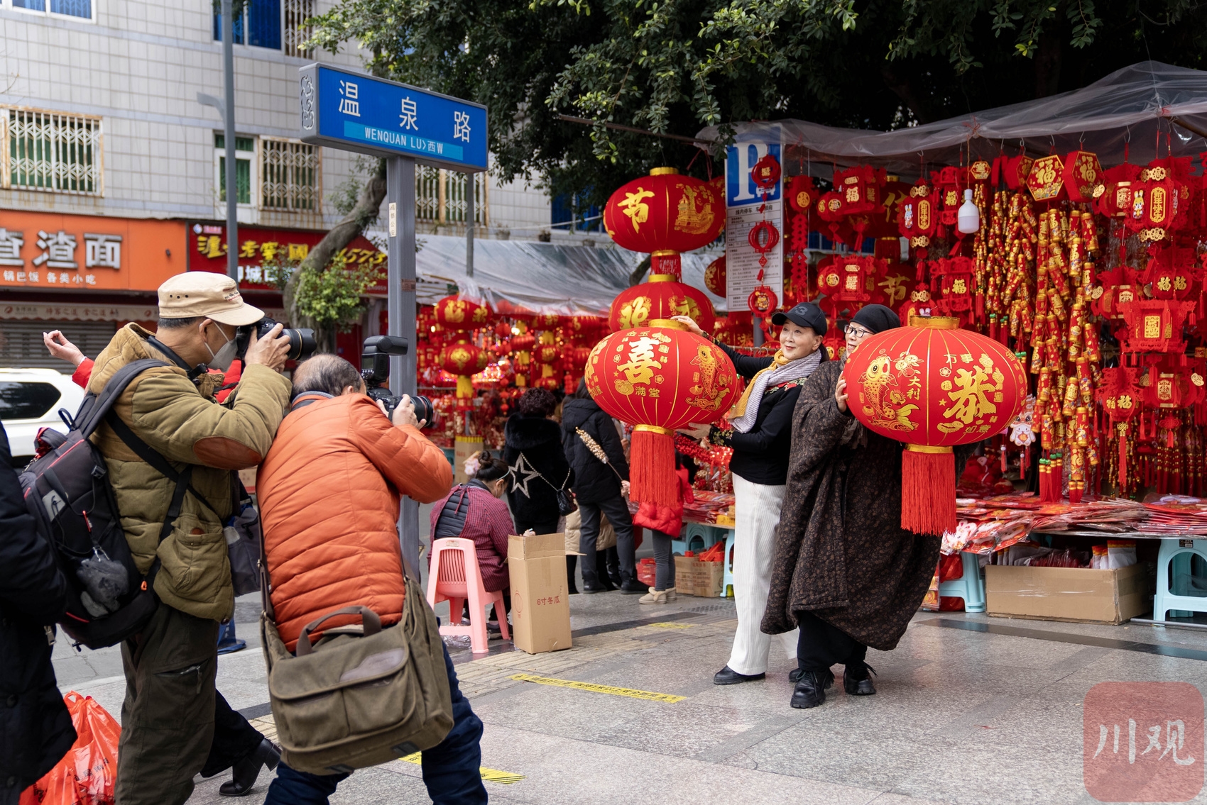 每当临近春节,成都市温江区温泉路就变得年味十足,热闹非凡。1月8日,四川在线记者在温泉路年货一条街看到,高挂的大红灯笼,金字书写的福字,各式各样的生肖兔挂件,琳琅满目的年货,来这里置办年货的人络绎不绝。这条街尽显喜庆祥和的气氛,一片火红的图景奏鸣着农历新年的序曲。