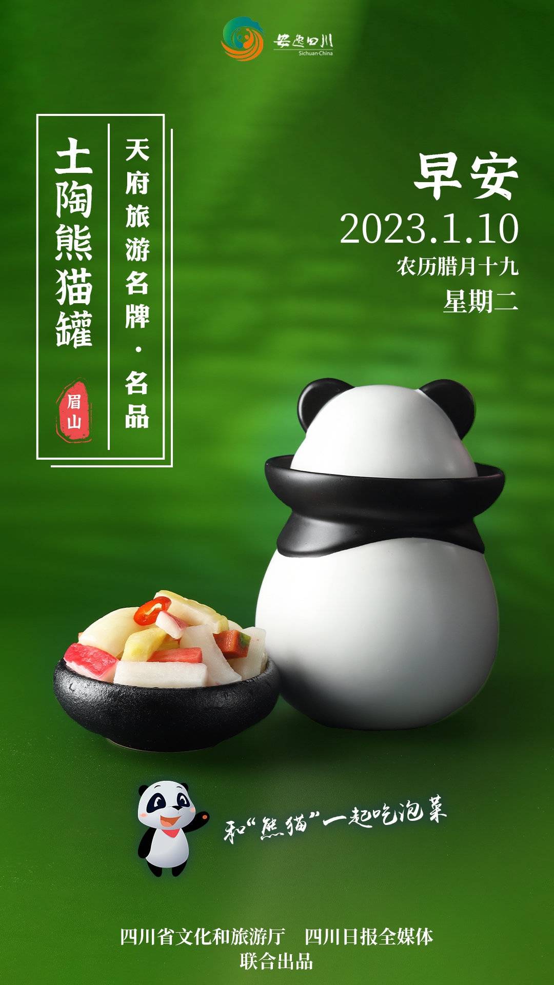 1月10日,星期二。今日天府旅游名牌日历海报带您走近天府旅游名品:土陶熊猫罐,和“熊猫”一起吃传统美食四川泡菜。