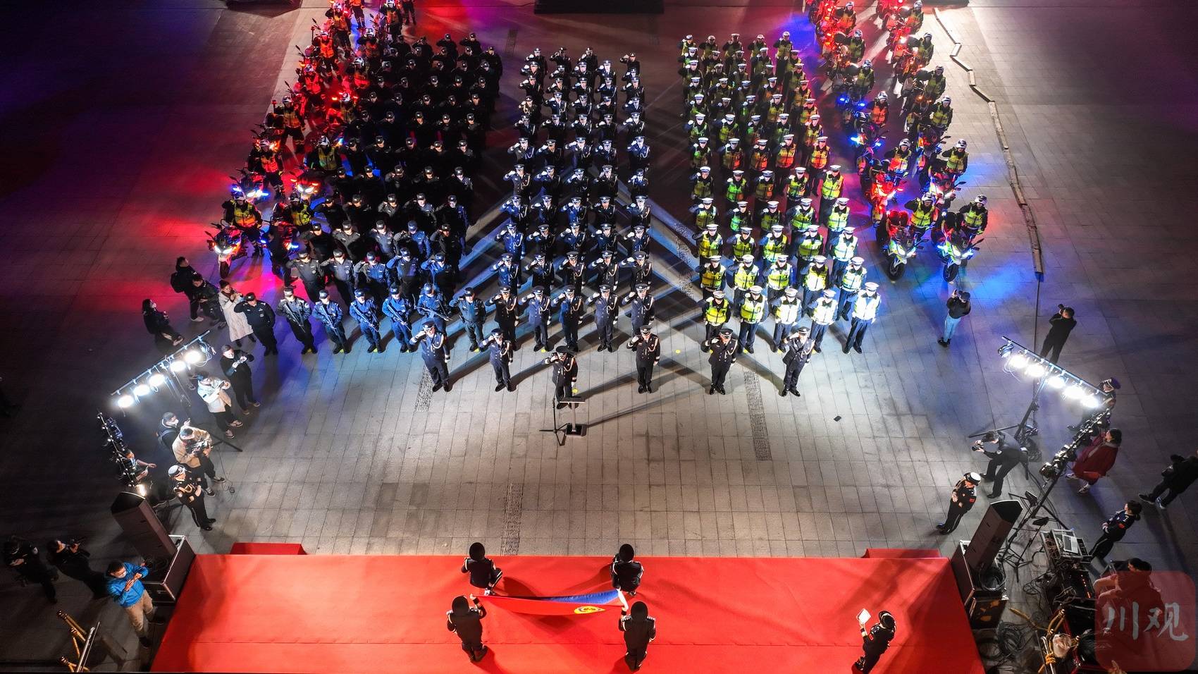 1月10日是第三个中国人民警察节。9日晚19时,东安湖体育公园火炬塔前,一道道光束点亮星空,来自成都市龙泉驿区的200名民警代表精神昂扬、整齐列队,面向警旗庄严宣誓,庆祝第三个中国人民警察节暨大运安保誓师大会。