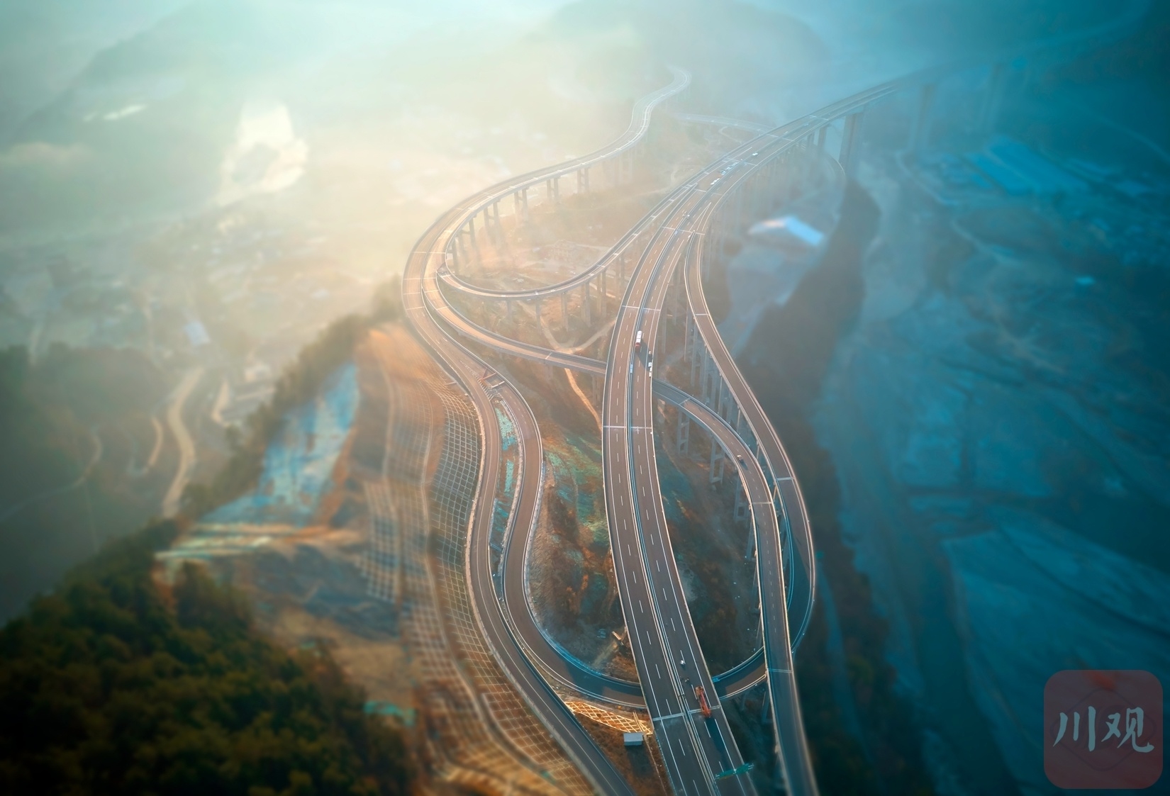 灵动的晨光在树林间跳动,互通大桥穿梭在山水田园间,一片清凉的阴影和一片灿烂的晨光互相交替,变幻的光影让人心旷神怡。