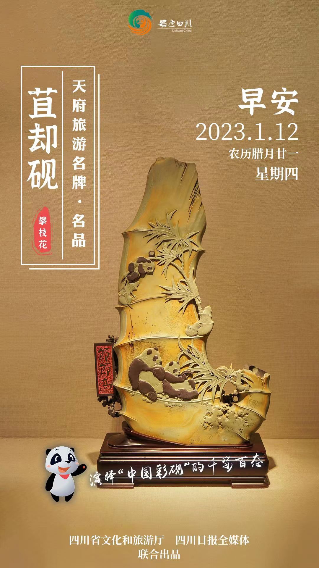 1月12日,星期四。今日天府旅游名牌日历海报带您走近天府旅游名品:苴却砚,看其演绎“中国彩砚”的千姿百态。