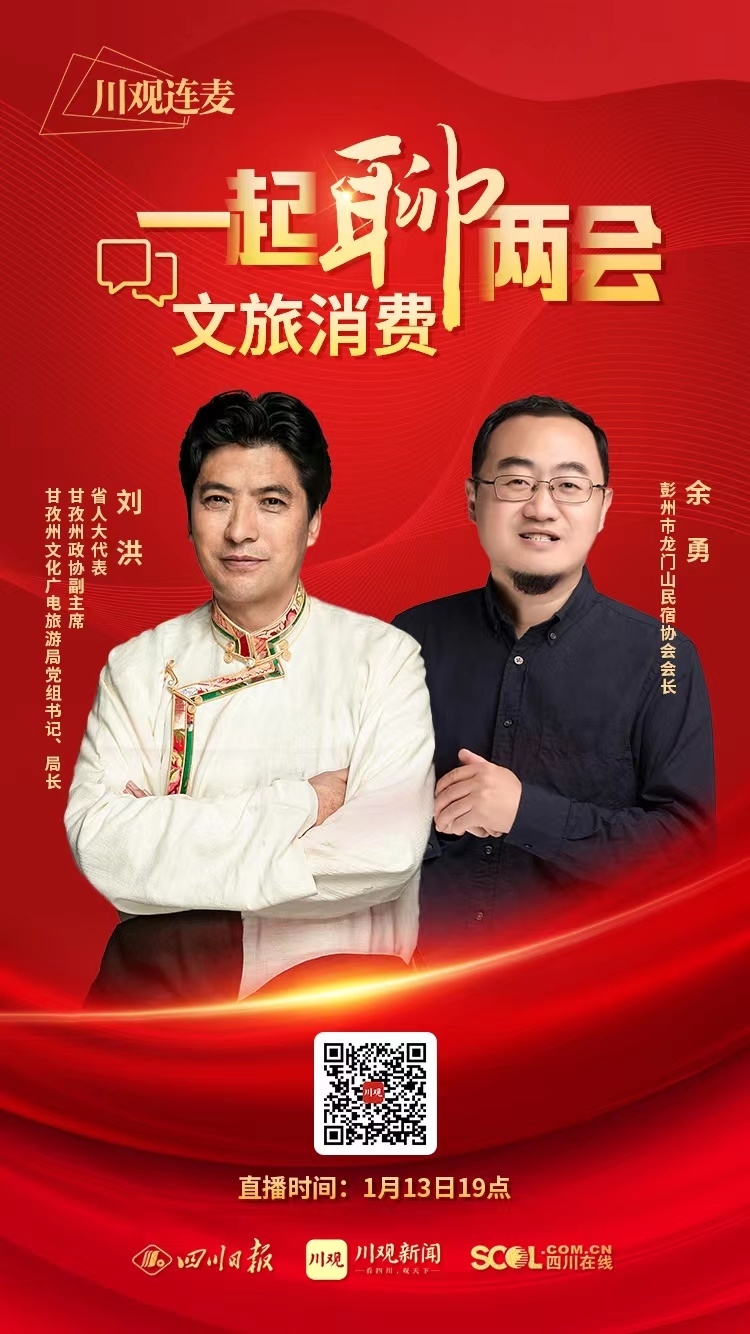 1月13日,2023年省两会特别报道·川观连麦系列直播——“一起聊两会”,第三期聚焦“文旅消费”主题,省人大代表、甘孜州文化广播电视和旅游局局长刘洪,与彭州市龙门山民宿协会会长余勇一起做客直播间,畅谈文旅产业发展形势,传授文旅营销秘诀。