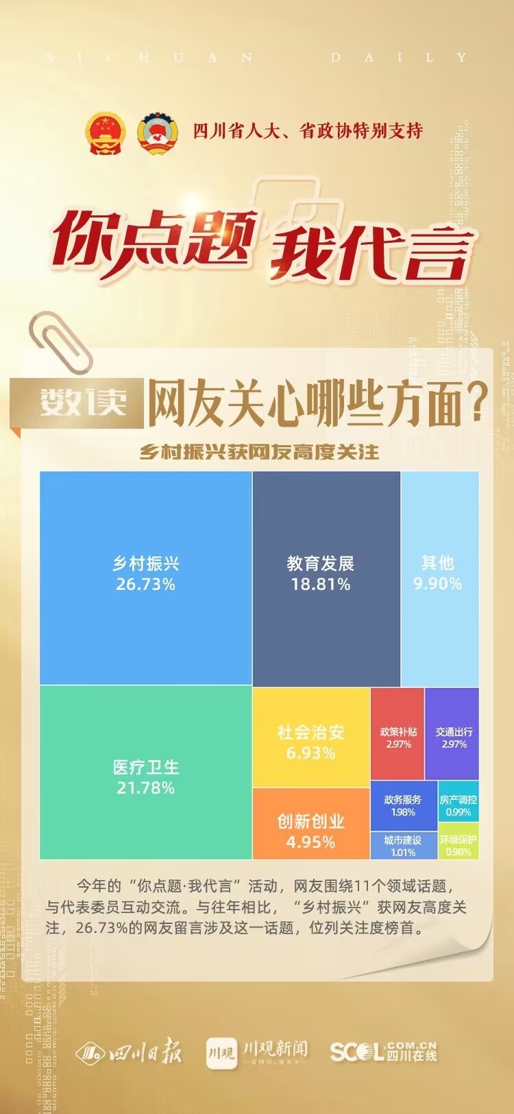 除乡村振兴外,医疗卫生、教育发展、社会治安、创新创业等领域话题的关注度仍居前列,留言占比分别达21.78%、18.81%、6.93%、4.95%。