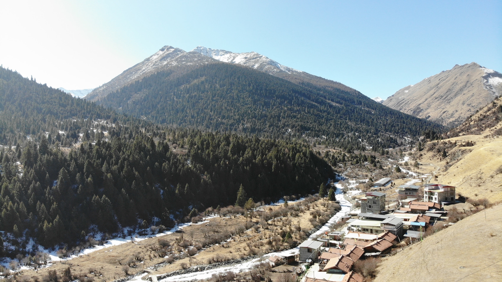 垫石头、挂防滑链、推车……在冰天雪地中忙了20多分钟后,汽车终于“脱困”。小心翼翼驾车半小时,途经卓小路隧道建设现场,再继续向前行驶5公里左右,小分队便到达小金县两河口镇木城村,雪山蓝天下,村民房顶一面面鲜艳的五星红旗,迎风飘扬。