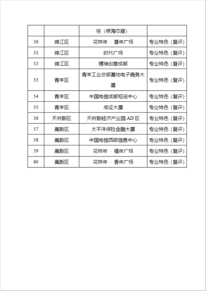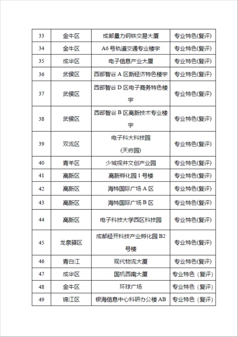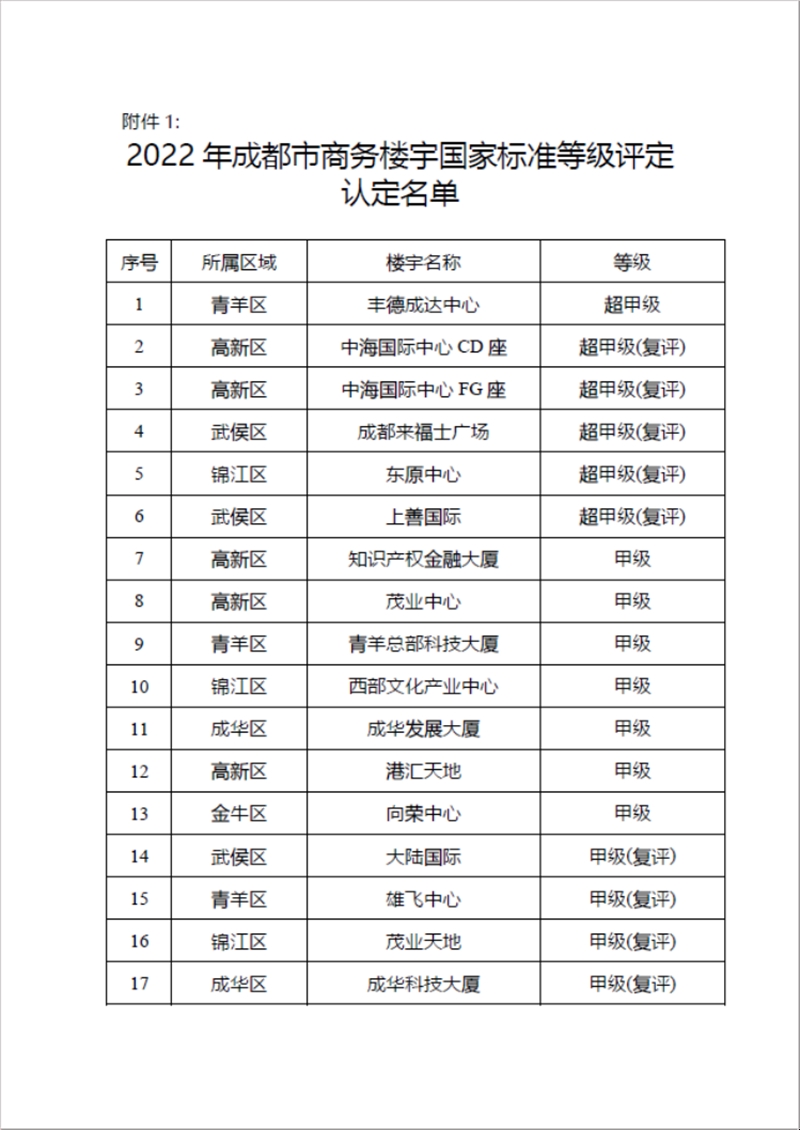作为全国首个实施商务写字楼等级评定的城市,成都市楼宇标准评定严格遵循政府监督、行业主导、社会参与、自愿申报、公正公开、动态管理的原则,而此次的超甲级、甲级写字楼,专业(特色)楼宇前期也经过2个多月的评选,通过申请、资格预审、抽选测评专家、书面评审、现场测评、入驻企业满意度调查、暗访等多项程序的严格筛选,最终共评出超甲级(国标)商务楼宇6栋、甲级(国标)商务楼宇11栋、专业(特色)楼宇60栋,其中新增超甲级(国标)商务楼宇1栋、甲级(国标)商务楼宇7栋、专业(特色)楼宇28栋,为成都市再树一批高品质商务标杆楼宇。目前,由成都牵头研制的楼宇经济三项国标不仅成功发布,而且在成都实施评定出了两批国家标准大楼,形成成都新的全国标准范本,为全国其他城市开展楼宇经济服务业标准化试点,提供了优秀案例。