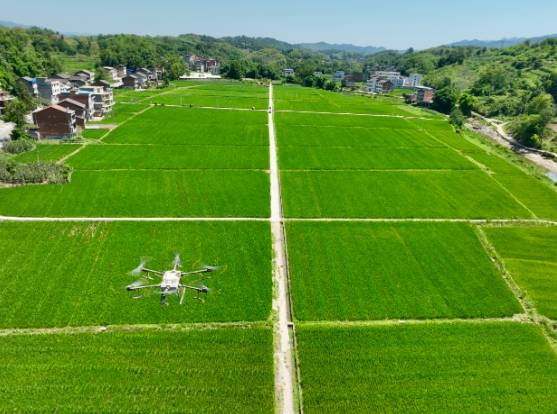 2022年7月,大竹县组织植保无人机给水稻制种基地提供免费飞防服务。王巍 摄