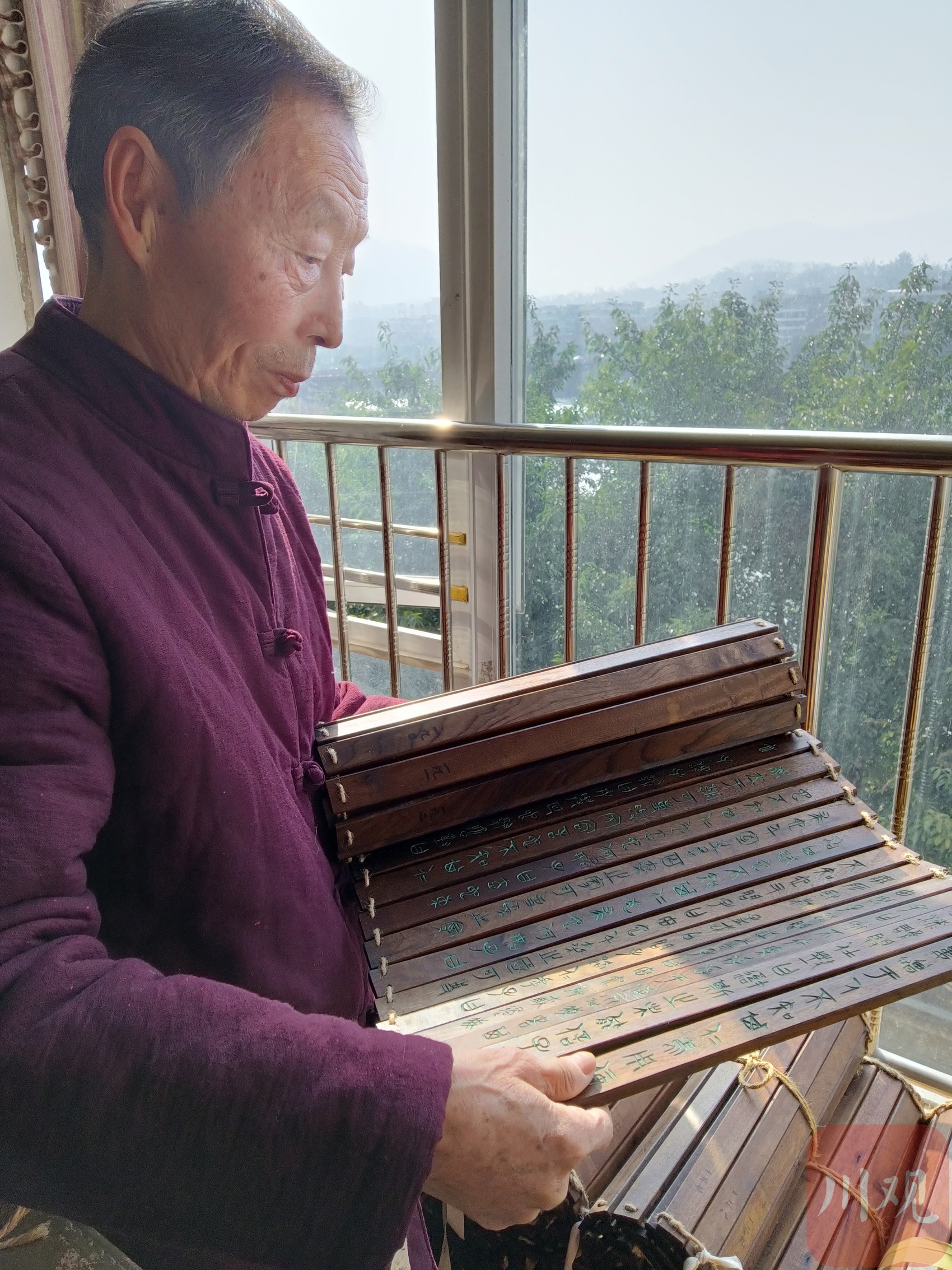 1月19日,冬日暖阳映照青衣江畔,走进史晋川家中,阵阵金丝楠木幽香传来。78岁的史晋川拿出新近装订成册的乌木简牍。
