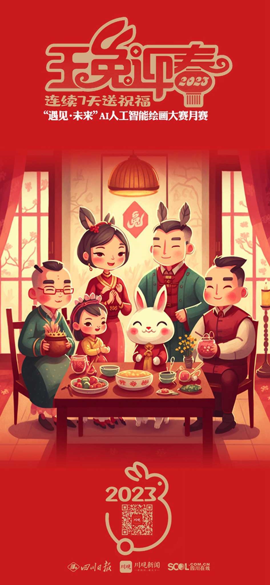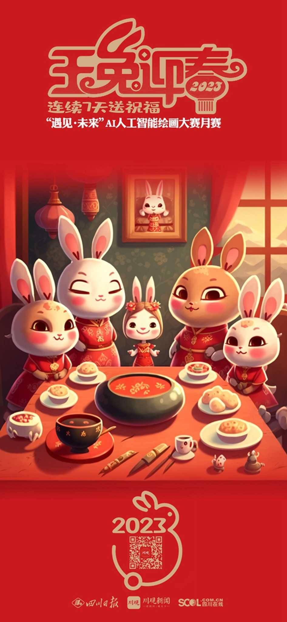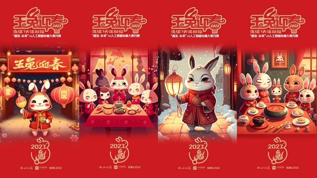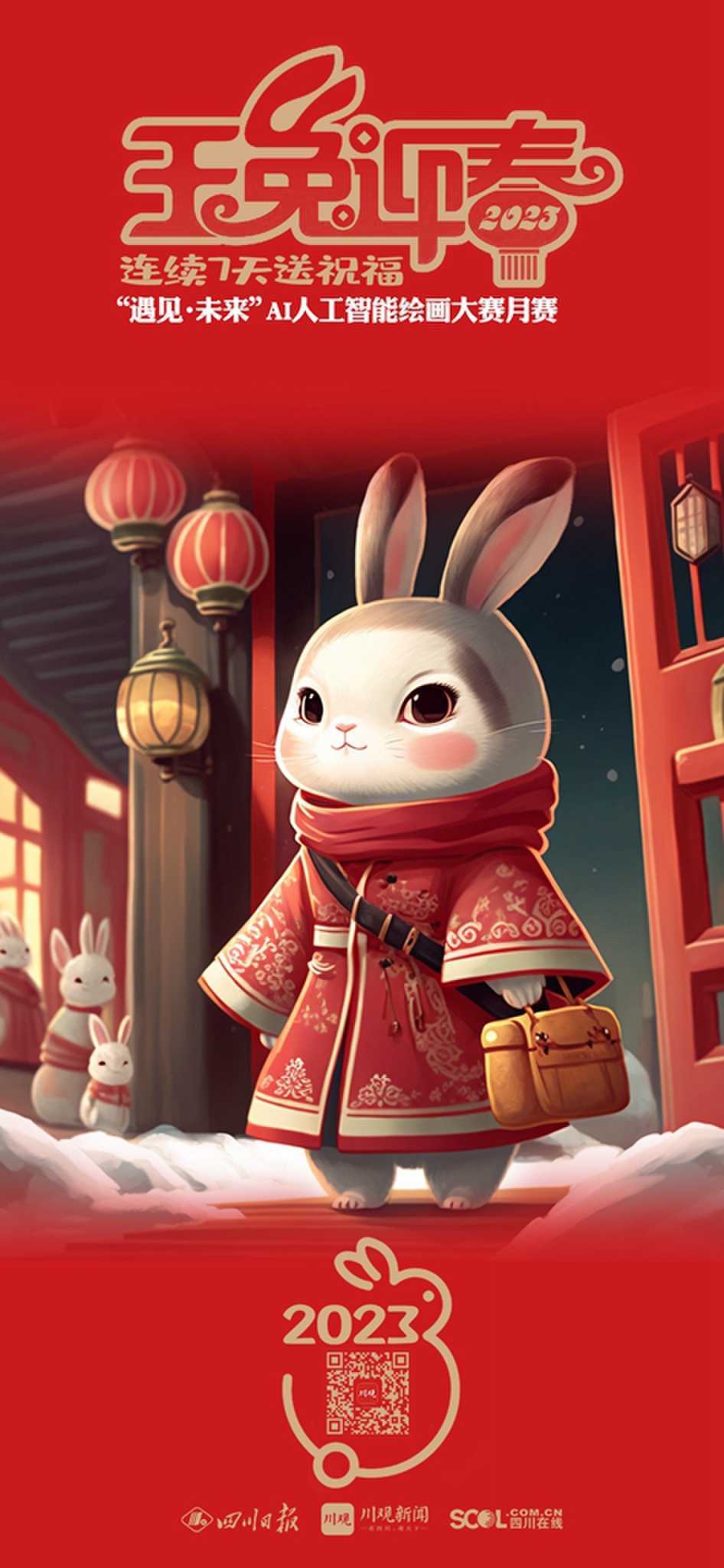 玉兔献瑞迎新年,在2023农历新年到来之际,参与 “遇见·未来”AI人工智能绘画大赛月赛的艺术家们将在1月21日(除夕)——1月27日(初六)连续7天,通过川观新闻客户端送出用AI画笔绘制的“瑞兔迎春”贺卡,祝福全球网友2023年大展宏“兔”,前“兔”似锦。今天,又是哪些创意满满的“瑞兔迎春”贺卡与您见面喃?快来看看吧!