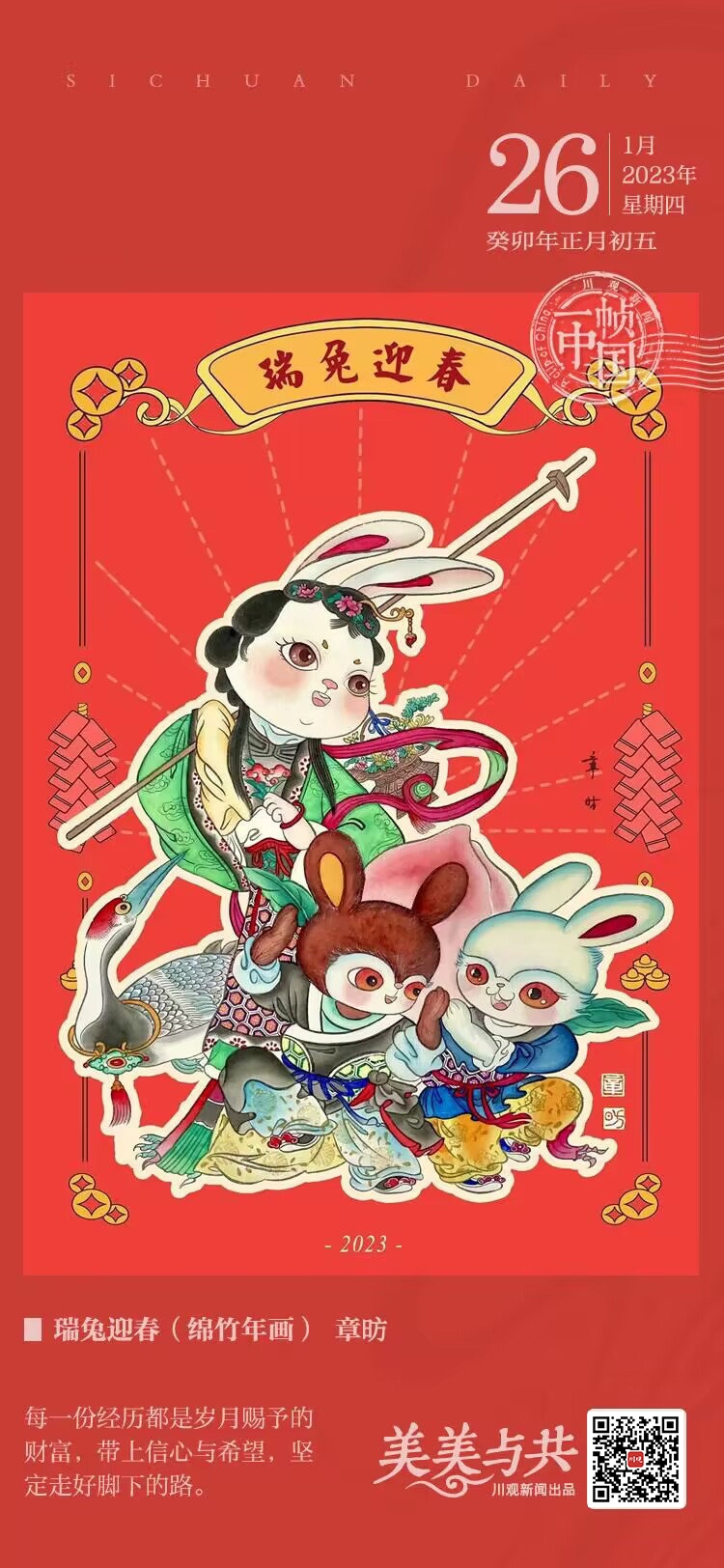 今年,章昉新创作的《瑞兔迎春》上有三只兔,大兔肩挑花篮,两只小兔则在一旁载歌载舞,旁边还有仙鹤、仙桃等元素,寓意健康平安祥和喜庆之意。她介绍,这幅《瑞兔迎春》取材于传统绵竹年画《麻姑献寿》的中堂画,颜色比传统的绵竹年画稍微要淡雅一点,想给人以如沐春风的感觉。