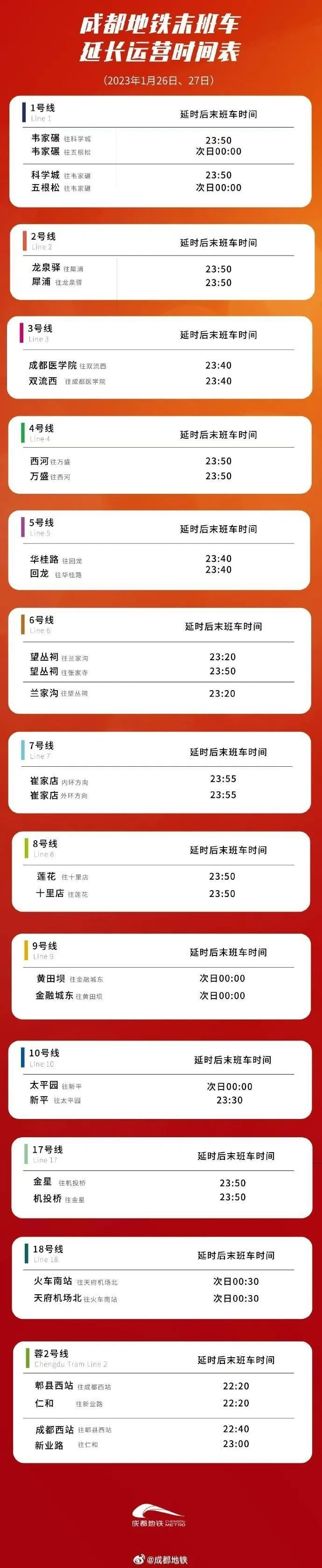 结合市民夜间出行及返程的需求,1月26日(初五)、1月27日(初六)全线网将延时运营,成都地铁服务热线同步延长服务时间。市民乘客可通过地铁电视、成都地铁App、成都地铁官方微博微信、站内告示等途径了解延时服务信息,车站现场将重点做好延时运营末班车信息提醒和现场咨询引导服务。