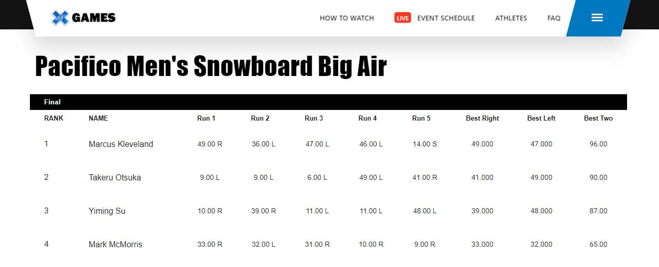 本届X-games单板滑雪男子大跳台规则为,参赛八名选手限时30分钟完成自选动作,取两次最好成绩相加为最终成绩。比赛中,苏翊鸣前四跳只有第二跳没有失误,获得39分的成绩。距离比赛结束不到2分钟,苏翊鸣迎来第五跳的机会,他顶住压力,完美完成1980,获得48分。最终两跳成绩相加,总分87分位列第三名。冠军被挪威选手马库斯揽获,他的总成绩为96分。