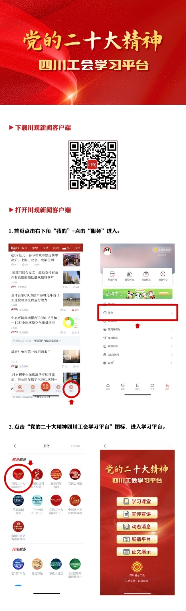 为全省工会系统和广大职工群众搭建一个学习宣传党的二十大精神的线上平台。2月1日,由省总工会联合川观新闻共同打造的“党的二十大精神四川工会学习平台”将正式上线。学习平台将持续在全省工会系统和广大职工群众中推出一批有声势、有影响、覆盖广的宣传宣讲活动,努力营造全省广大职工群众奋进新征程、建功新时代的浓厚氛围。