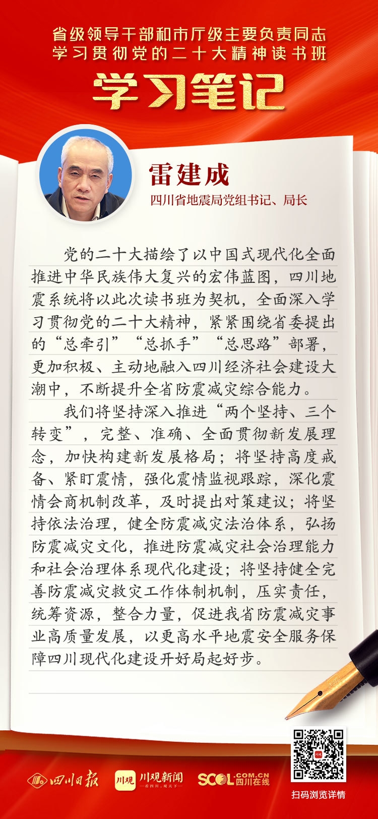 党的二十大描绘了以中国式现代化全面推进中华民族伟大复兴的宏伟蓝图,四川地震系统将以此次读书班为契机,全面深入学习贯彻党的二十大精神,紧紧围绕省委提出的“总牵引”“总抓手”“总思路”部署,更加积极、主动地融入四川经济社会建设大潮中,不断提升全省防震减灾综合能力。