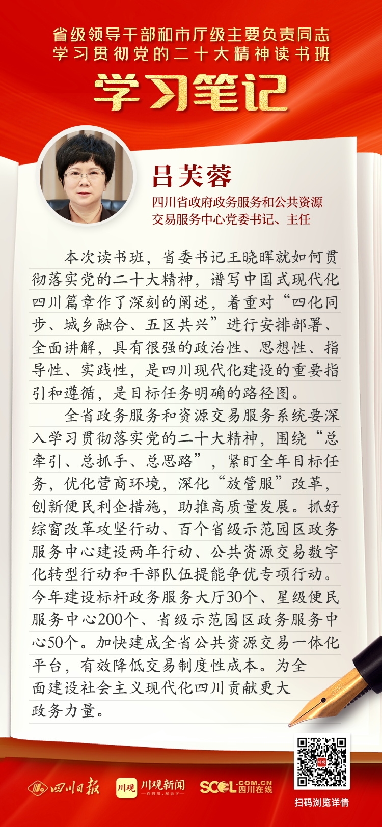 全省政务服务和资源交易服务系统要深入学习贯彻落实党的二十大精神,围绕“总牵引、总抓手、总思路”,紧盯全年目标任务,优化营商环境,深化“放管服”改革,创新便民利企措施,助推高质量发展。抓好综窗改革攻坚行动、百个省级示范园区政务服务中心建设两年行动、公共资源交易数字化转型行动和干部队伍提能争优专项行动。今年建设标杆政务服务大厅30个、星级便民服务中心200个、省级示范园区政务服务中心50个。加快建成全省公共资源交易一体化平台,有效降低交易制度性成本。为全面建设社会主义现代化四川贡献更大政务力量。