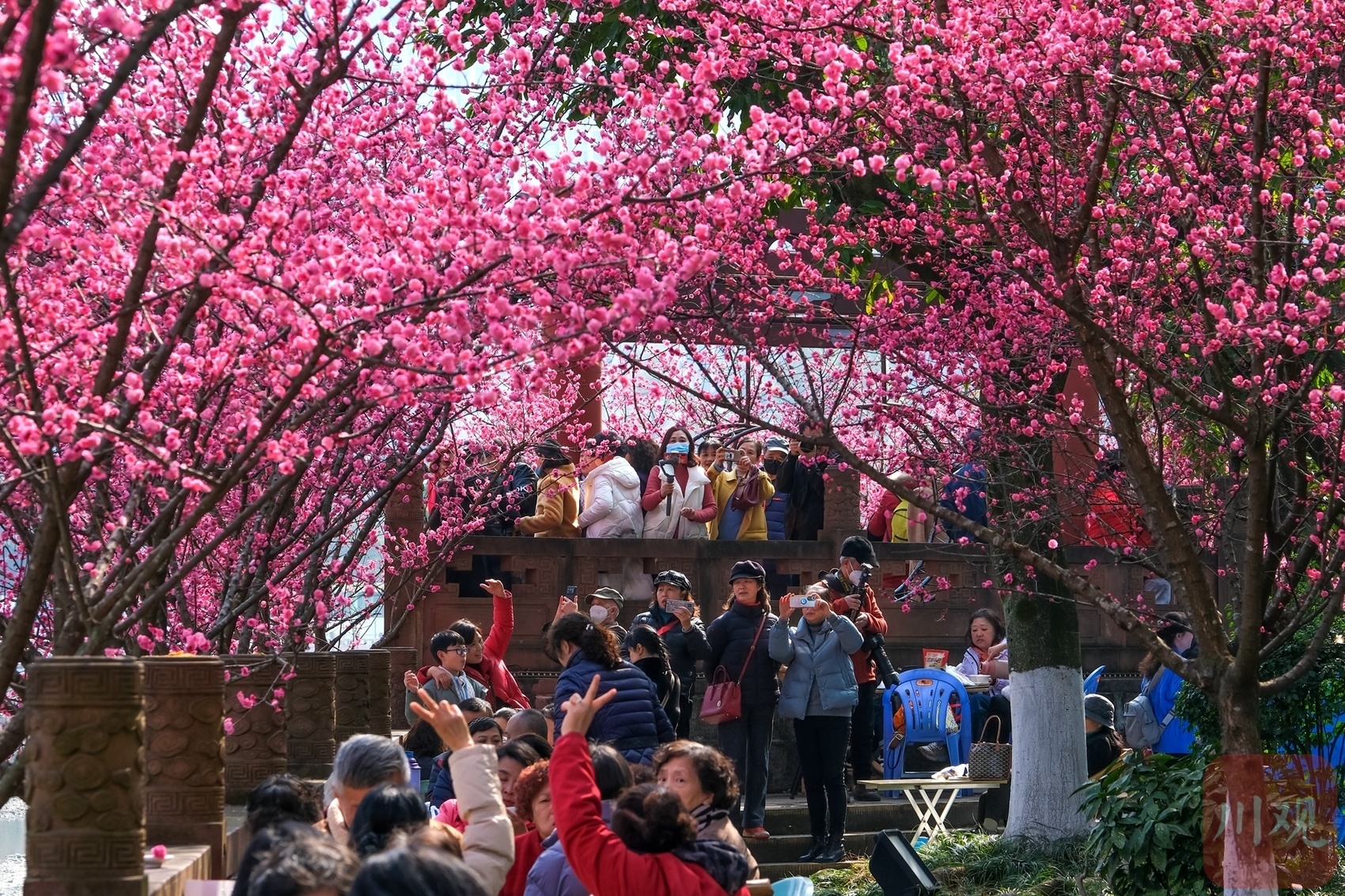 2023年2月9日,成都天气晴好,望江公园盛开的红梅,吸引了络绎不绝的市民前来赏花拍照喝茶晒太阳。暖阳下,望江公园的锦江河堤仿佛变成了一个镶上花边的红色彩带,飘在希望的春天里。