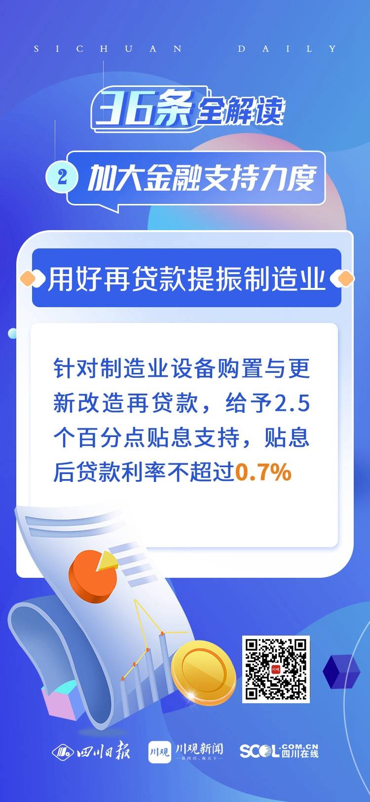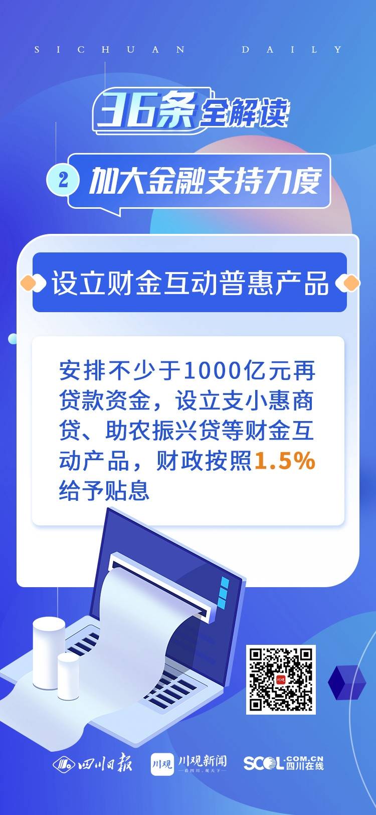 以央行再贷款货币政策工具为例,“36条”中进一步明确,今年人民银行成都分行将安排不少于1000亿元再贷款资金,推广支小惠商贷、助农振兴贷等财金互动产品,财政按照1.5%给予贴息,贴息后借款利率不超过一年期贷款基础利率(LPR)加15个基点(BP)。