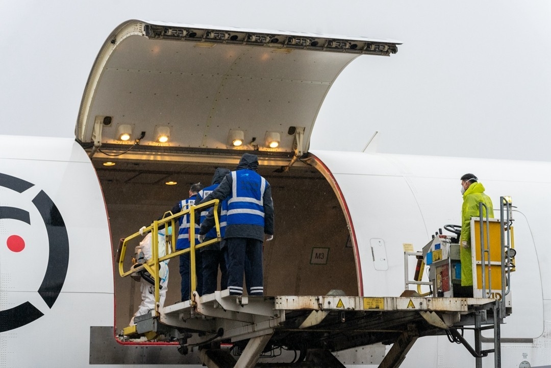 顺丰O37564航班打开舱门,工作人员准备入内。
