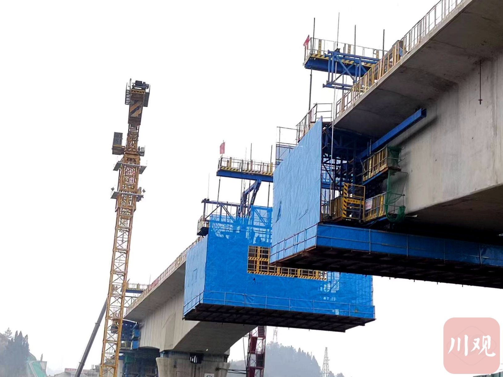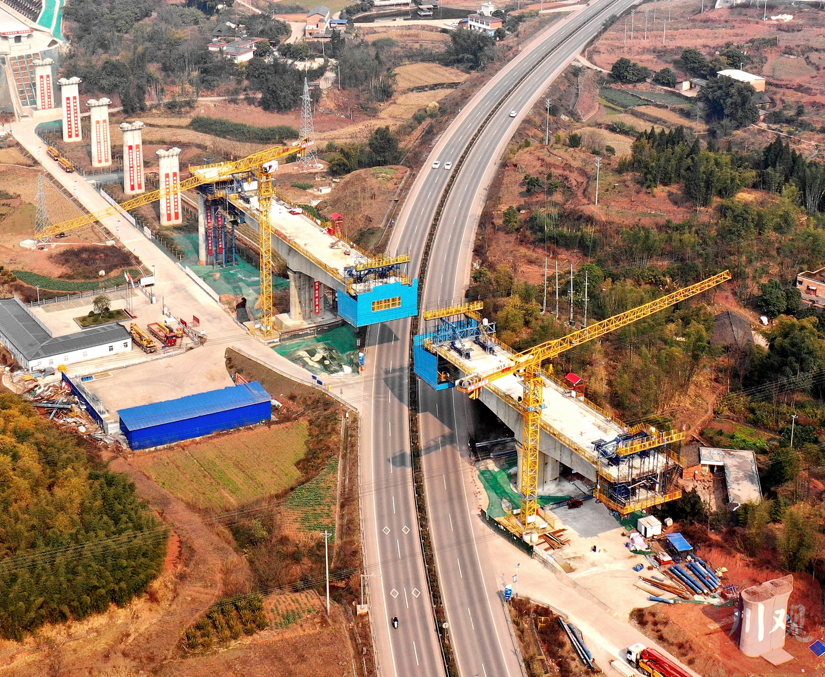 2月20日,在渝昆高铁马龙湾特大桥施工现场,多台大型机械正在紧张有序施工作业,一派繁忙景象。马龙湾特大桥位于宜宾市高县来复镇境内,为渝昆高铁川渝段重要控制性工程之一。大桥全长592.5米,目前,桥梁下部结构已全部完工,正在进行跨宜庆路连续梁的施工,预计3月底实现全桥合龙。