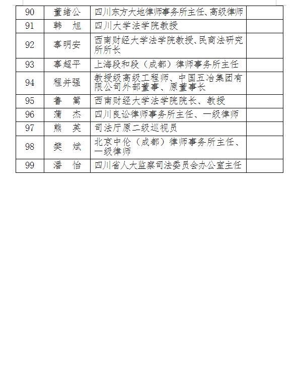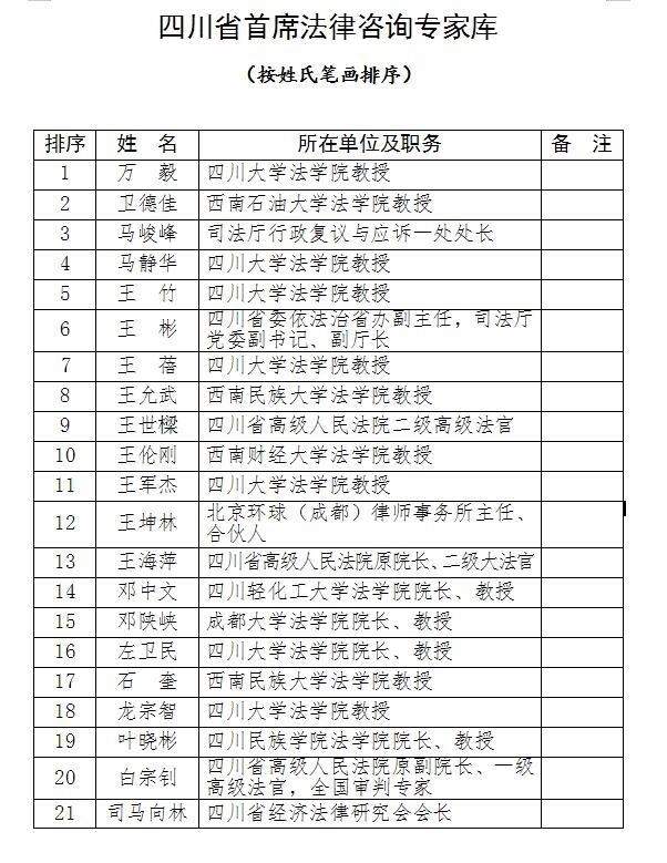 2月22日,省委政法委、四川省法学会发布四川省首席法律咨询专家库的公告。公告显示,根据《四川省首席法律咨询专家制度实施办法(暂行)》要求,中共四川省委政法委员会、四川省法学会于2022年11月22日—11月24日对四川省首席法律咨询专家库拟入库专家名单进行了公示,公示期间无任何异议,现将99名首席专家库专家名单予以发布。