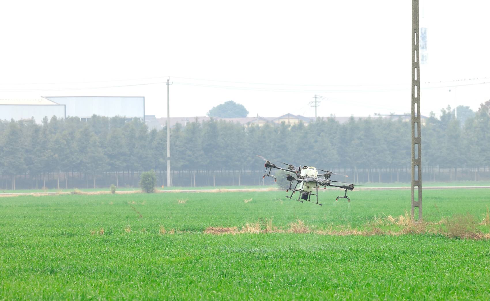 搭乘电梯,登上德阳广汉市金鱼镇上岺村的观景平台,极目远望,绿色麦浪绵延不绝。田边,不时有无人机腾空而起,或补水灌溉,或来回喷洒农药。