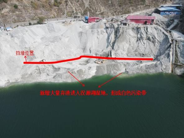 2020年4月,我省自查长江生态环境问题指出,峨汉高速沿汉源湖段堆料入湖,省推动长江经济带发展领导小组办公室印发整改方案,要求加强板羊沟弃渣日常监管,严禁临河堆渣,并于2021年6月底前完成入湖弃渣清理转运并验收销号。路桥集团无视整改要求,仅编制了弃渣场行洪论证与河势稳定评价报告(以下简称行洪论证报告),未开展实质性整治。2021年7月,有关行业主管部门现场验收时,发现该弃渣场未按行洪论证报告要求,对板羊沟河道采取渠化补救措施,持续占用河道堆渣、弃渣继续被冲刷进入汉源湖湿地,不予通过验收,并要求落实行洪论证报告,完善补救措施,于2022年6月底以前将弃渣全部处理完毕,恢复河道原貌,消除环境安全隐患。2021年6月至2021年8月期间,乐汉高速公司多次发文督办该问题,但路桥集团依然我行我素、置若罔闻,整改工作一拖再拖,直至此次督察进驻前,仍有约19万m³弃渣沿河堆存,并在转运过程中野蛮施工,违规将作业面扩展至汉源湖湿地水域,形成白色污染带。