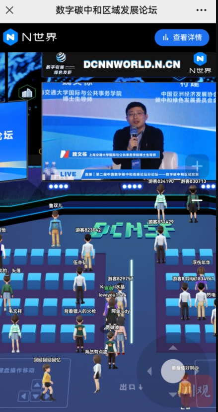 记者选择了“分论坛”按钮,屏幕上随即弹出“数字科技企业绿色低碳发展”“绿色低碳 数字生活”“数字碳中和投融资与高质量发展”“数字碳中和区域发展论坛”四个选项条;选择目的地后,瞬间便被“传送轴”带进“数字碳中和区域发展论坛”分会场。会议室里,已有多位“与会者”通过大屏观看该会场的直播。“我”既可以点击大屏观看高清直播,也可以选择“返回”被传送带回到论坛大厅。