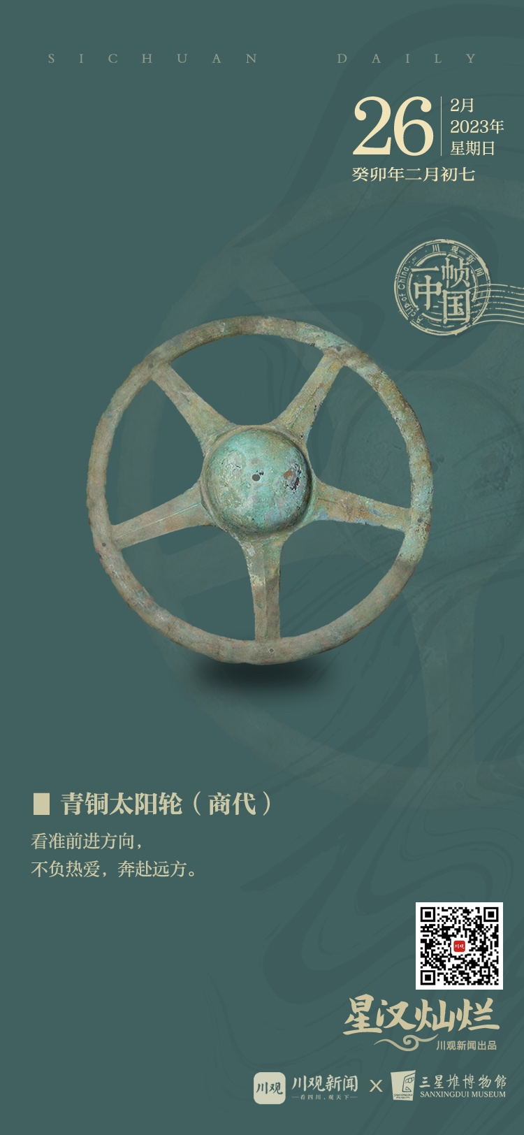 因造型酷似汽车方向盘而为人所熟知的三星堆青铜太阳轮,器物构型为圆形,正中阳部凸起,其周围五芒的布列形式呈放射状,芒条与外围晕圈相连接。