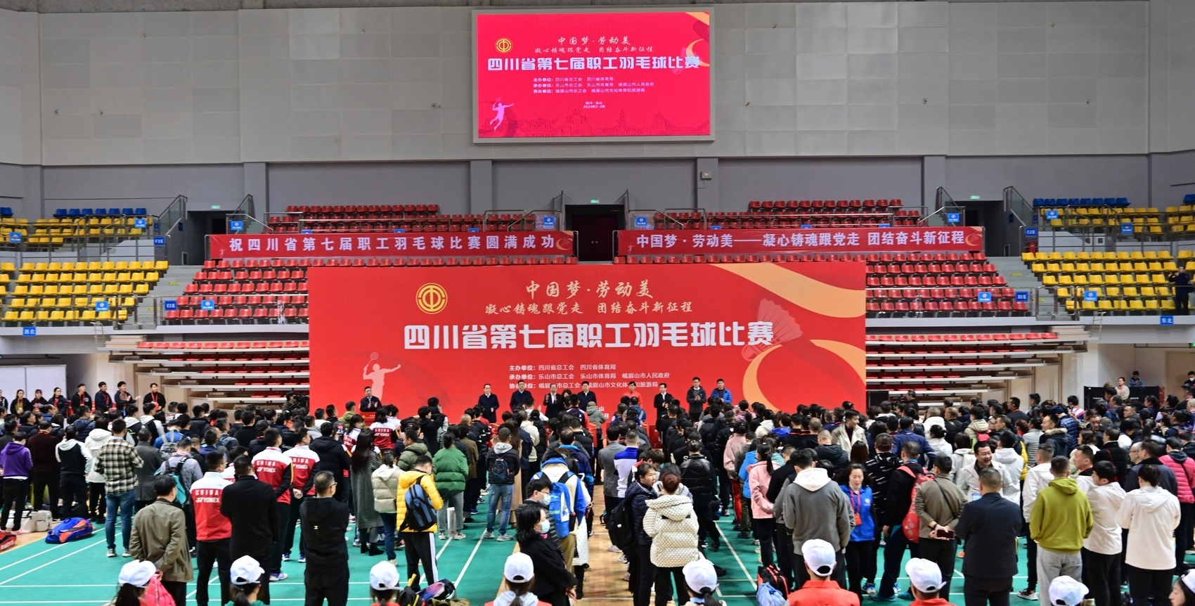 2月28日,“中国梦·劳动美——凝心铸魂跟党走 团结奋斗新征程”四川省第七届职工羽毛球比赛在峨眉山体育馆开幕。来自成都、泸州、攀枝花、自贡、遂宁等市州的总工会、省产业(局)工会、企业集团(公司)工会的42支工会代表队的领队、教练员、运动员600余人参与到本次比赛中。