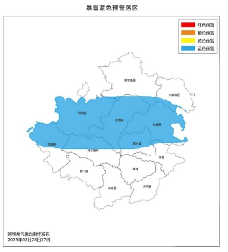 2月28日下午,阿坝州气象台发布暴雪蓝色预警:2月28日20时到3月1日20时,受高原低值系统和地面冷空气共同影响,阿坝州有一次明显降水天气过程。全州大部阴天间多云有小雪(雨)到中雪(雨)或雨夹雪,其中,阿坝县、红原县、松潘县、黑水县、马尔康市北部和壤塘县北部将有5毫米以上降雪。请各相关部门注意防范大雪、局地阵地大风等天气带来的不利影响。
