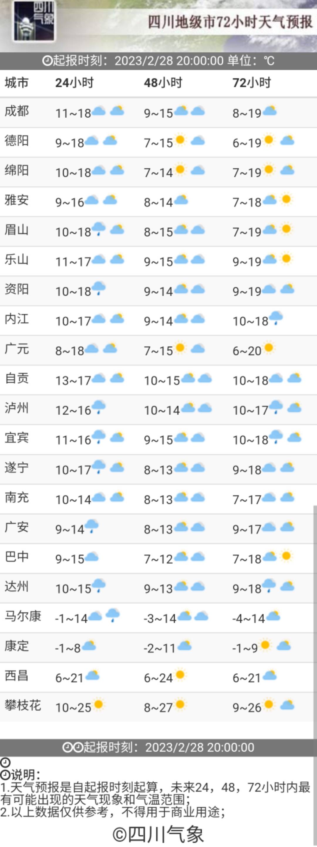 四川省气象台预计,未来三天,盆地各市多云间阴,东部、南部早晚有分散小雨;1日川西高原北部阴天间多云有阵雪(雨),局部中雪,川西高原南部和攀西地区大部时段多云间晴,空气干燥,森林、草原火险气象等级较高。