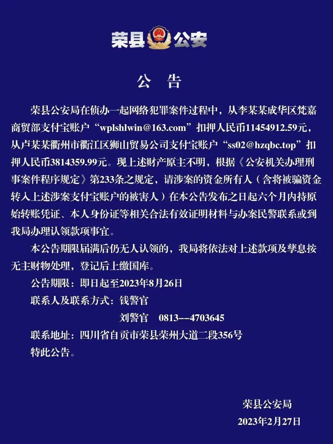 27日,四川省自贡市荣县公安局发布公告称,该局在侦办一起网络犯罪案件过程中,从涉案人员李某某、卢某某二人分别持有的支付宝账户扣押人民币共计1500余万元,系原主不明财产。