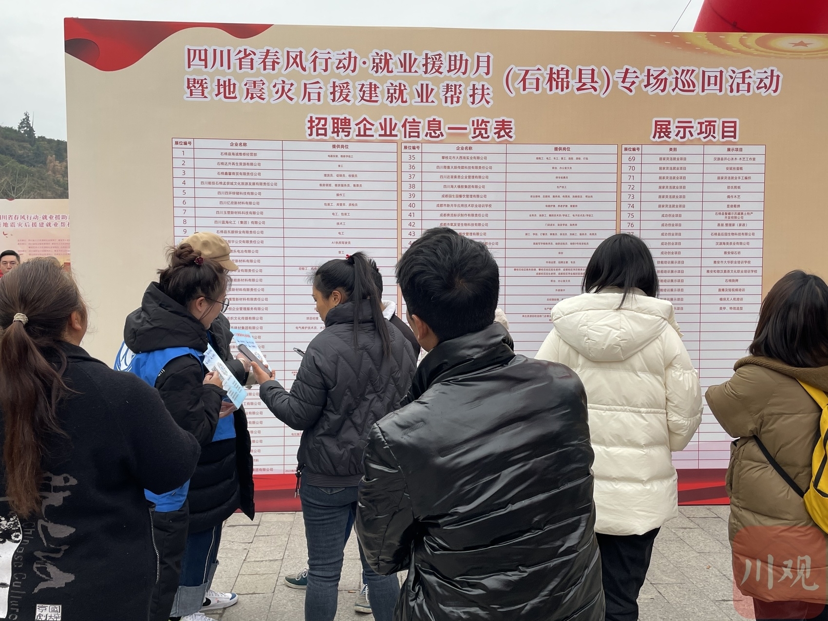 当天,由四川省人力资源和社会保障厅、雅安市人民政府主办,成都、眉山、攀枝花、雅安等市人社局、石棉县政府承办的春风行动·就业援助月暨地震灾后援建就业帮扶(石棉县)专场巡回活动在王岗坪乡游客服务中心举行。来自成都、眉山、攀枝花、雅安等地的68家企业,为当地群众带去3600余个就业岗位。这也是2023年全省首场灾后重建就业帮扶专项活动。