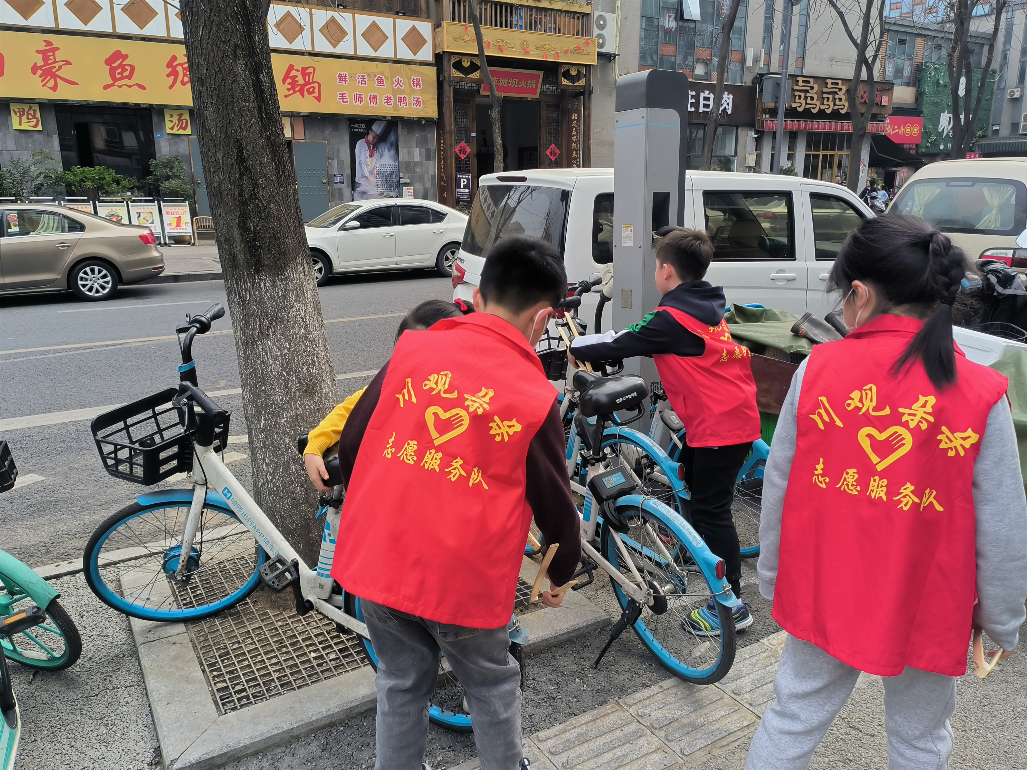 小志愿者们在整理街道单车。